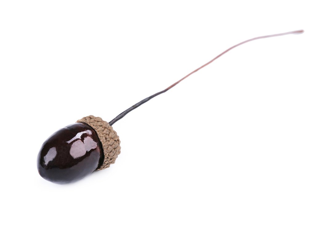 Dekorační žalud je vyrobený z polystyrenu, kalíšek je přírodní. Ve stonku je drát, takže ho můžete libovolně tvarovat. Plody žaludu vyniknou v podzimních vazbách, věncích apod.- Délka: 11 cm