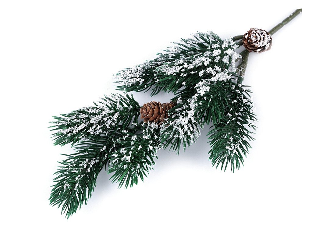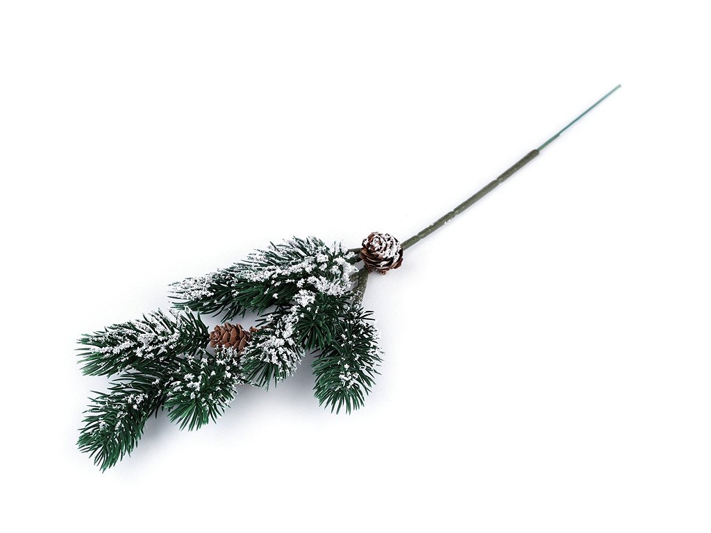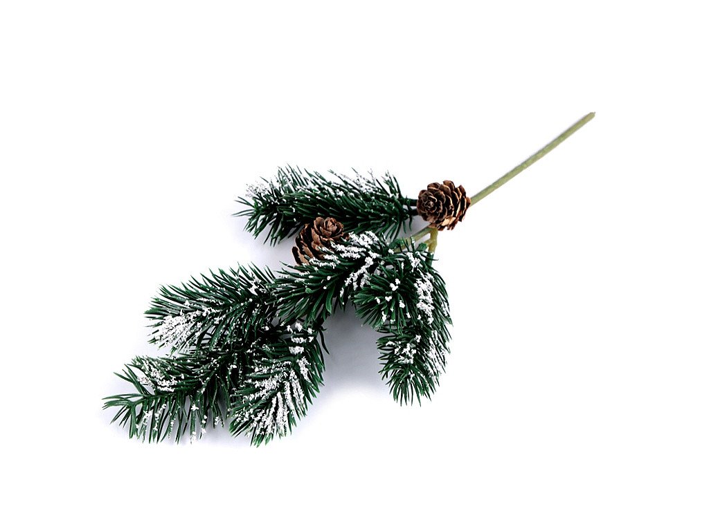 Dekorační větvičku smrku doplňují přírodní šišky. Je lehce posypaná umělým sněhem. Díky drátu můžete větvičku tvarovat. Použití: Větvičku využijete na vánoční a zimní aranžování. Vynikne na věncích, v truhlících, ale i v ikebanách a vázách.- Délka: 33 cm