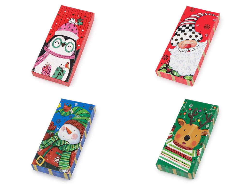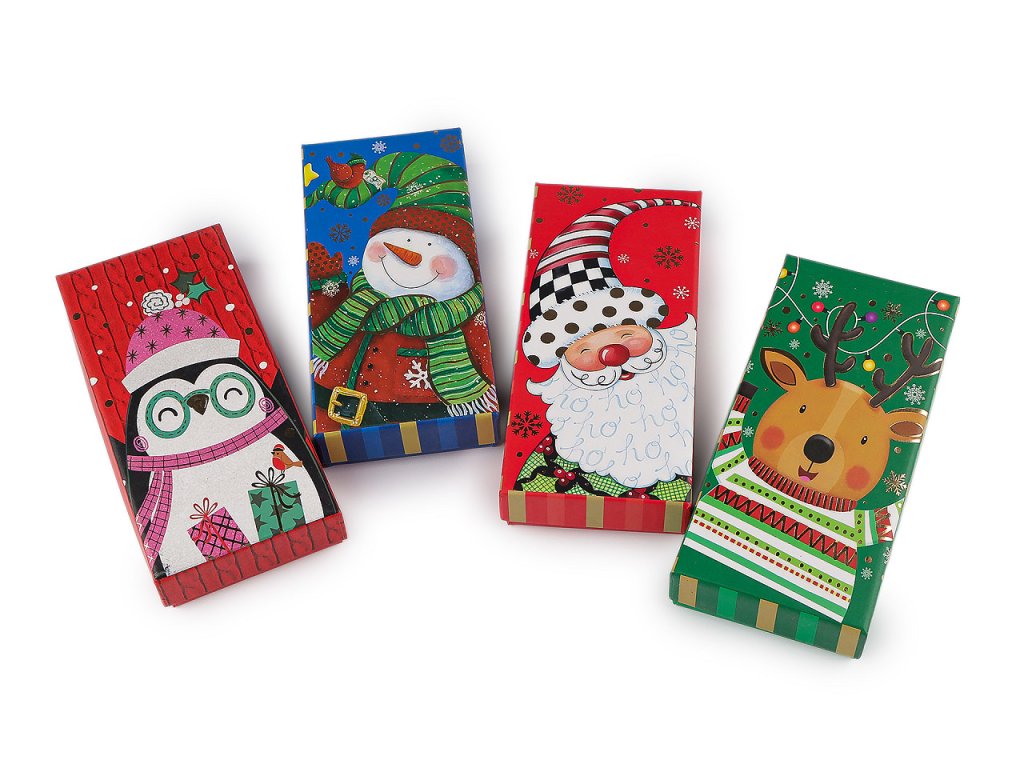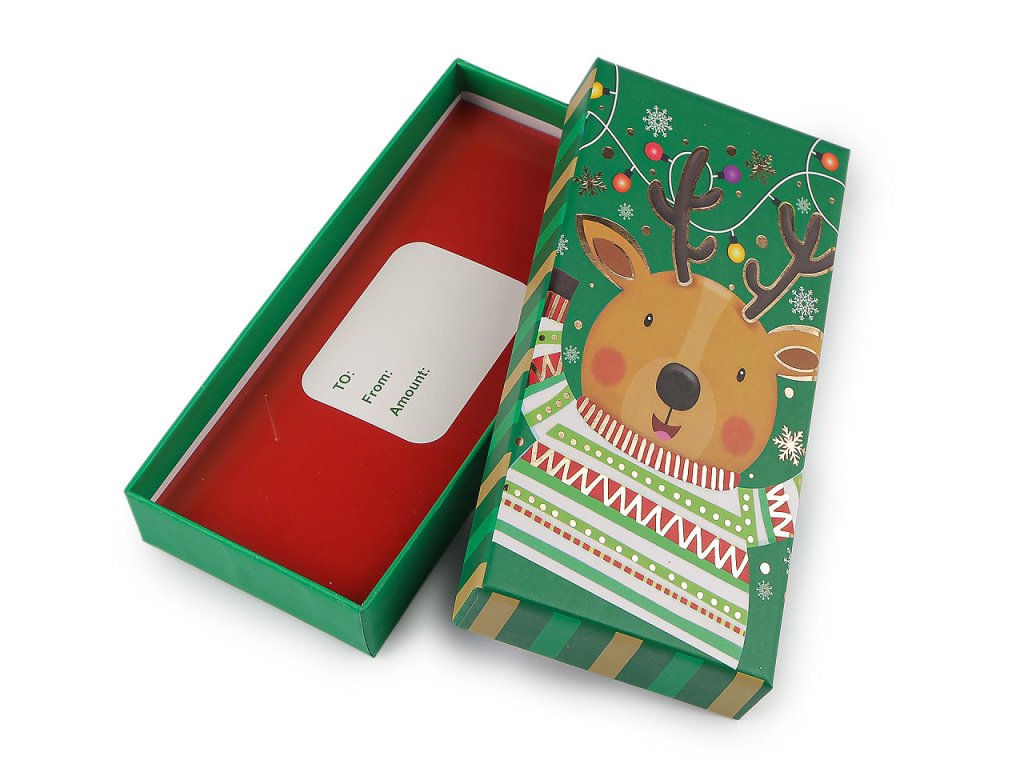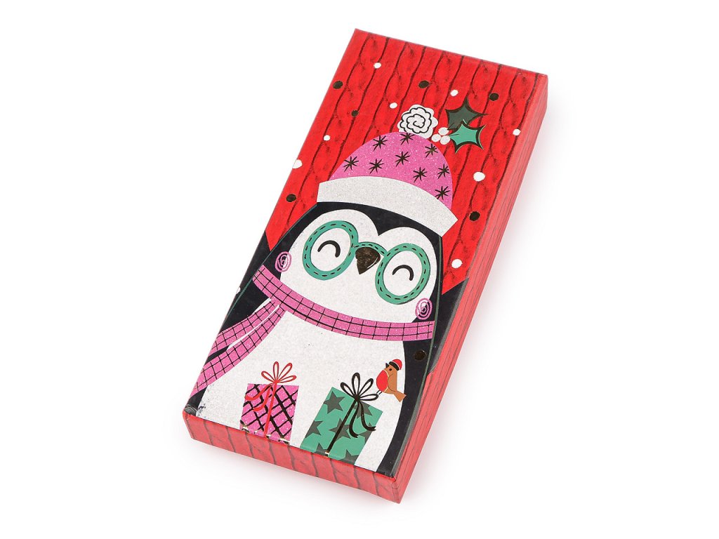 Vánoční krabička se skvěle hodí na zabalení malého plochého vánočního dárku. Je klasická, otevírací s víkem, je velice kvalitní, vyniká svou pevností. Víko zdobí barevný potisk. Uvnitř má papírovou kartičku, na kterou můžete napsat věnování. Dva šikmo umístěné výřezy můžete využít na lepší připevnění vloženého předmětu. Krabička nemá atest na potraviny. Pochoutky a jiné laskominy doporučujeme vložit zabalené v sáčku.- Rozměry: 8 x 17 cm