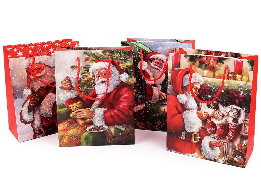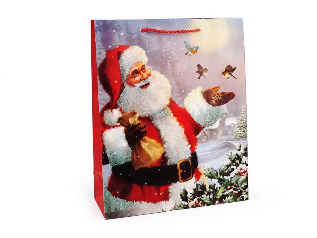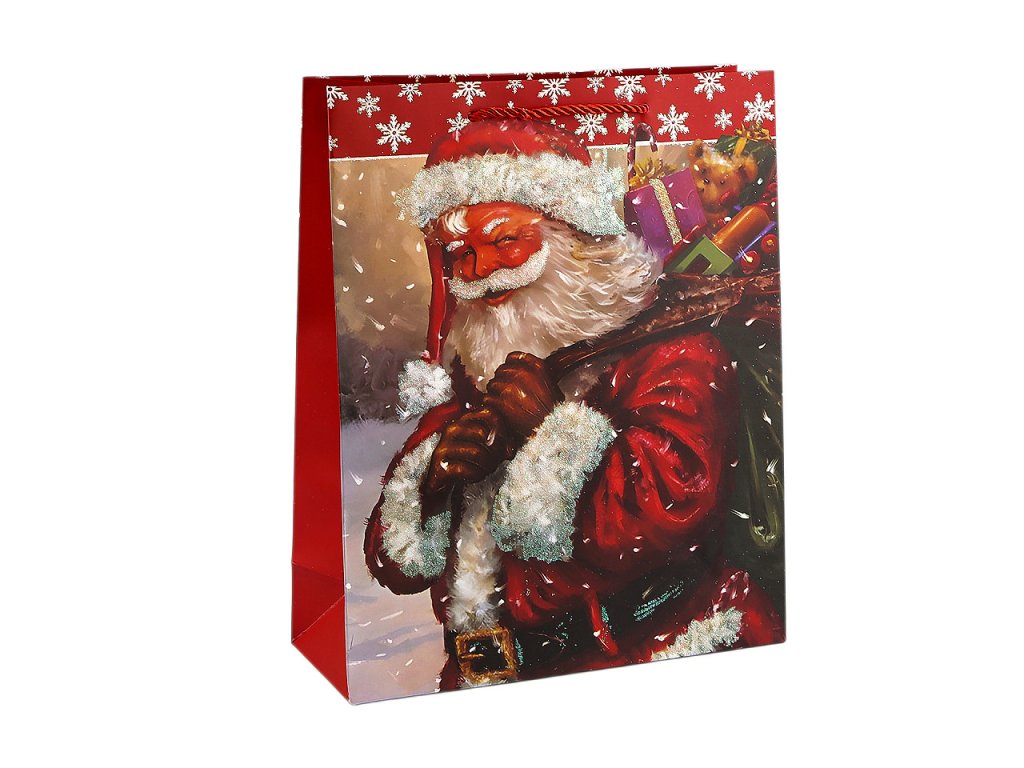 Vánoční dárková taška s motivem Santy Clause je vyrobená z kvalitního pevného křídového papíru. Přední strana tašky je ozdobená glitry. Ucha tašky jsou ze spletené šňůry. Taška vám ušetří čas při balení dárků.- Rozměry: 32 x 26 x 10 cm