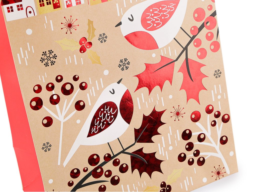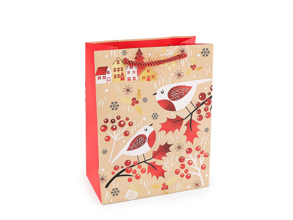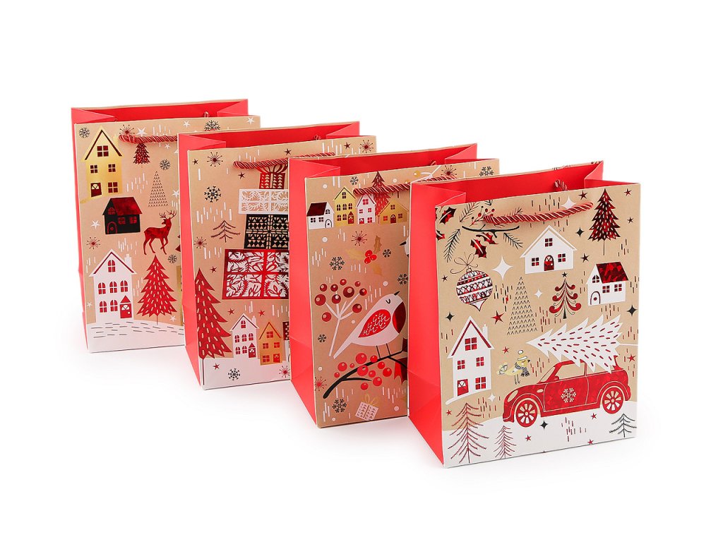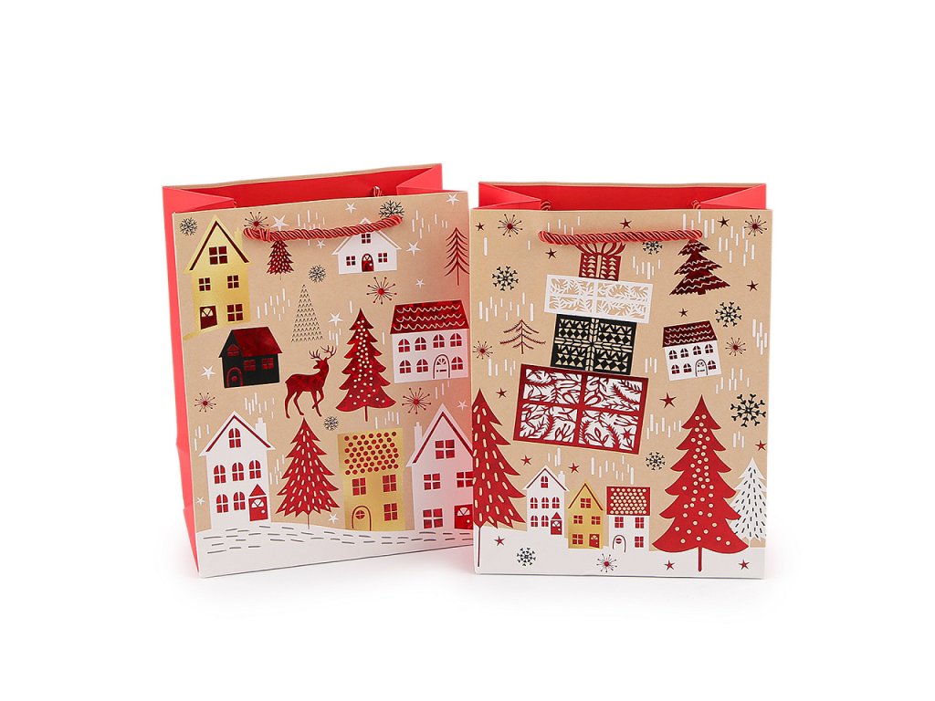 Sada vánočních dárkových tašek je ideální volbou pro balení vašich nejrůznějších vánočních překvapení. Hodí se pro různé velikosti dárků, od menších po středně velké předměty, ať už se jedná o oblečení, knihy, kosmetiku nebo hračky. Ušetří vám spoustu času při balení. Jsou vyrobené z kvalitního pevného křídového papíru. Přední strana je ozdobená potiskem s metalickými detaily, zadní strana má barevný potisk, boky jsou jednobarevné. Ucha tašky jsou z kroucené saténové šňůry.- Rozměry: 18 x 23 x 10 cm