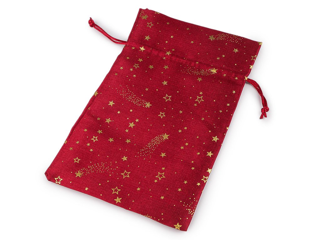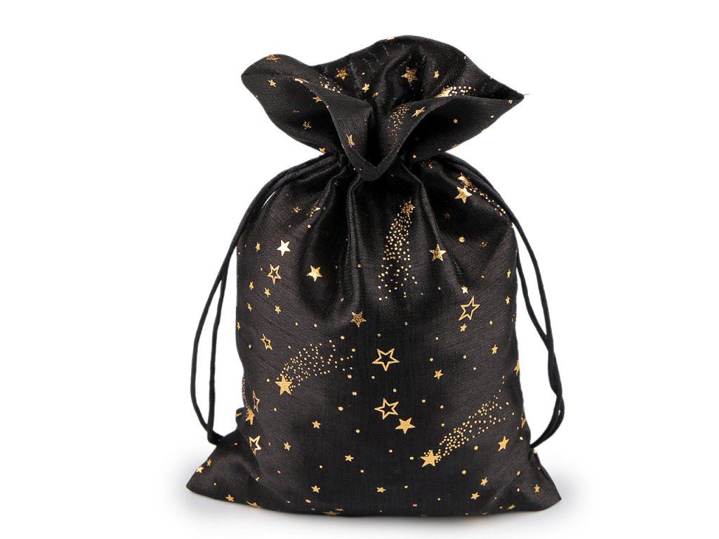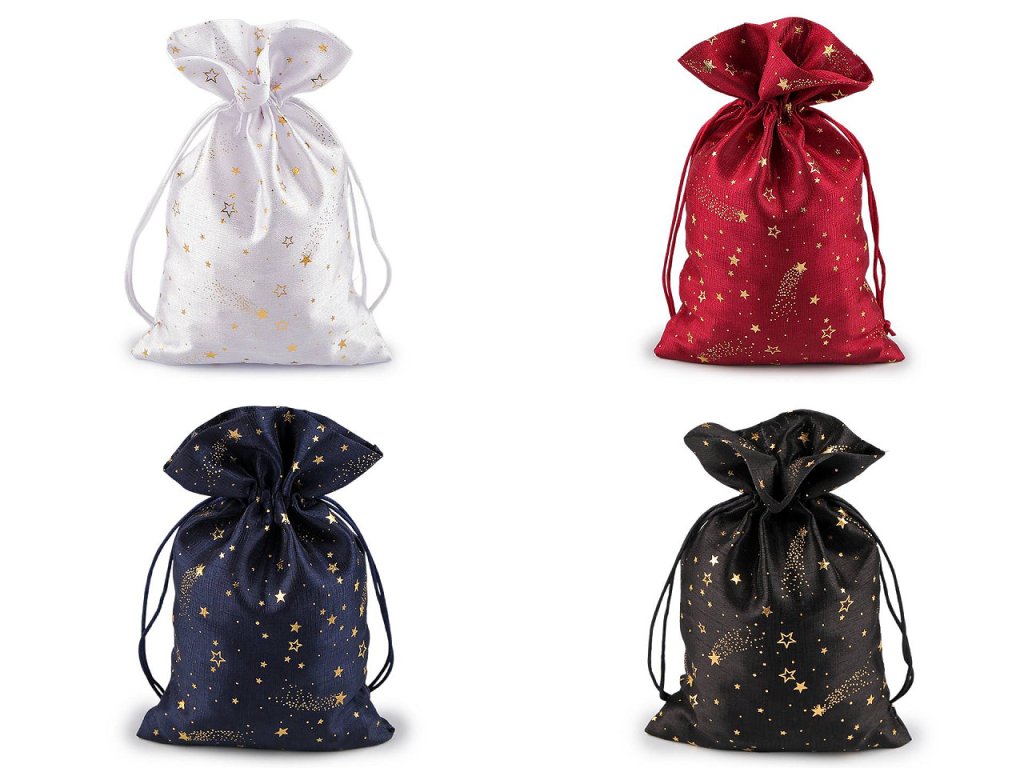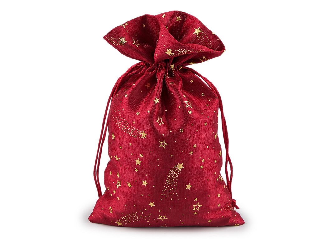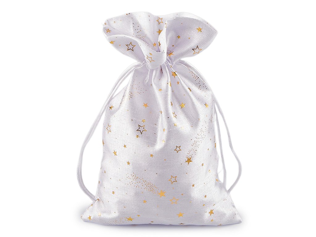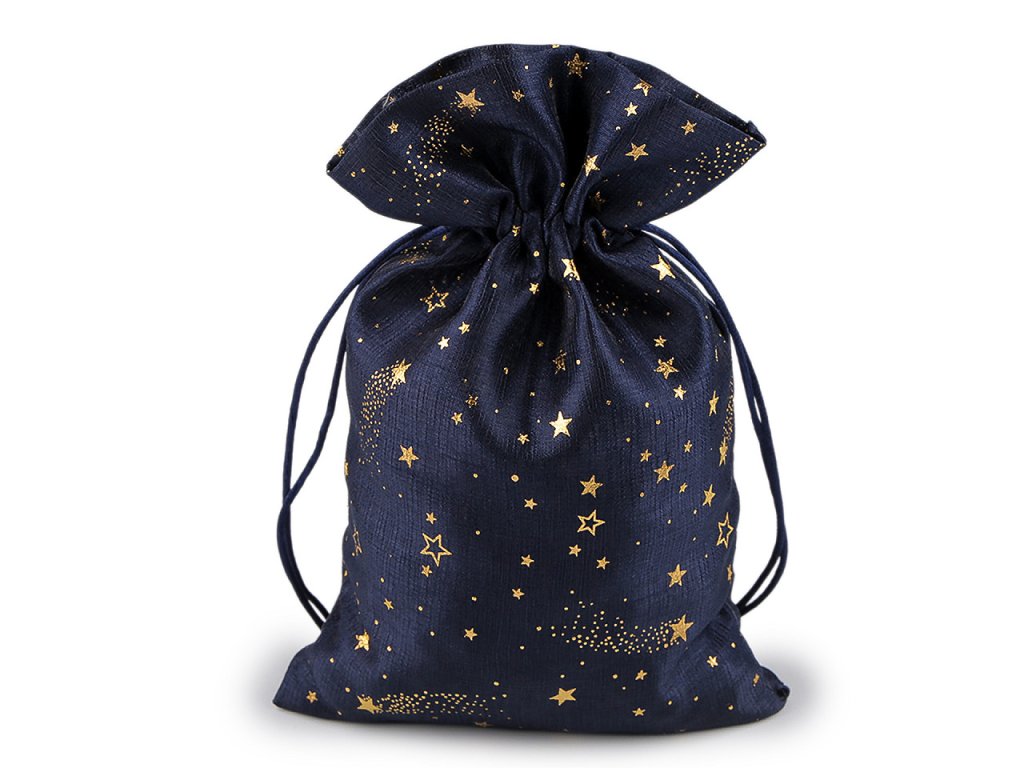 Vánoční dárkový pytlík je středně velký, z obou stran ozdobený potiskem zlatých metalických hvězdiček. Působí elegantně a luxusně, můžete ho použít na dárky nebo ho naplnit mikulášskou nadílkou, ušetří vám čas při balení. Dá se naaranžovat i jako vánoční dekorace. Stahuje se pomocí kulatých saténových šňůrek, dárku dodá osobní kouzlo a půvab.- Šíře: 20 cm
