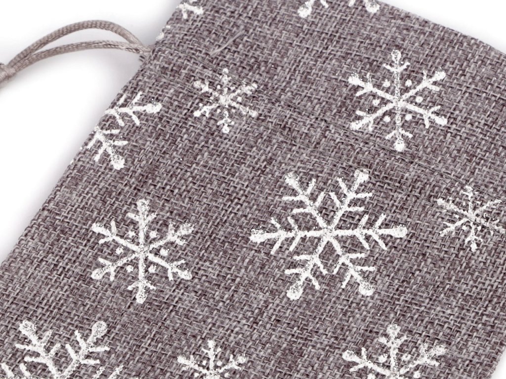 Dárkový pytlík s potiskem vloček je zajímavý materiálem, který imituje jutu. Potisk je jemně ozdobený třpytivými glitry. Pytlík se stahuje pomocí saténových šňůrek. Do pytlíku můžete schovat drobné dárky nebo jej použít jako vánoční dekoraci. Můžete jej použít jako stylovou alternativu k tradičnímu balicímu papíru, která zaručeně potěší jak obdarovaného, tak i vás. Je také skvělý pro uskladnění drobných předmětů po celý rok.- Šíře: 13 cm