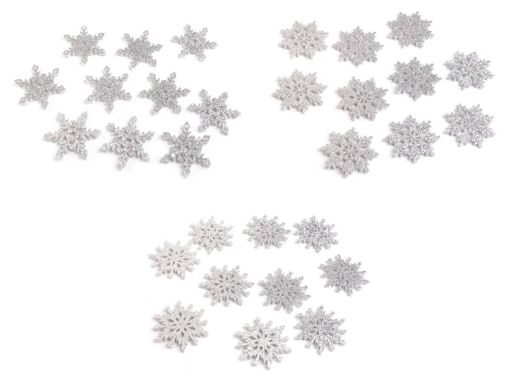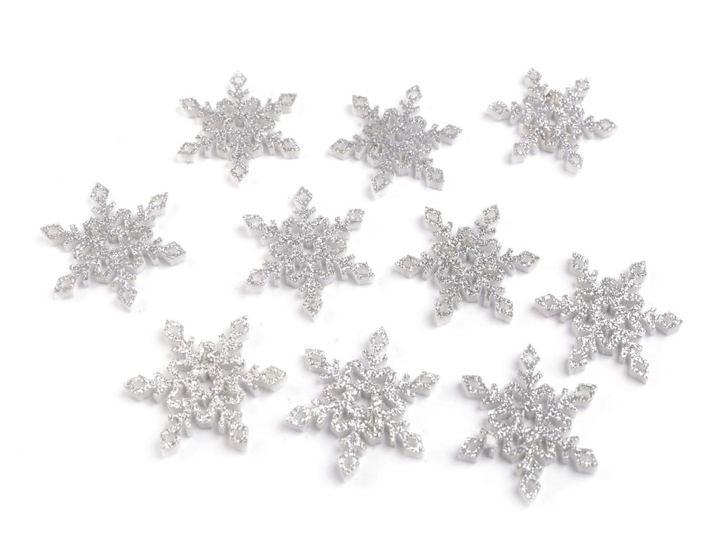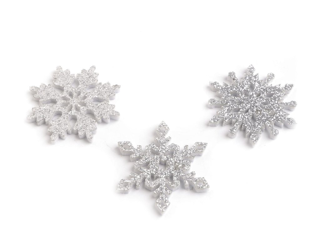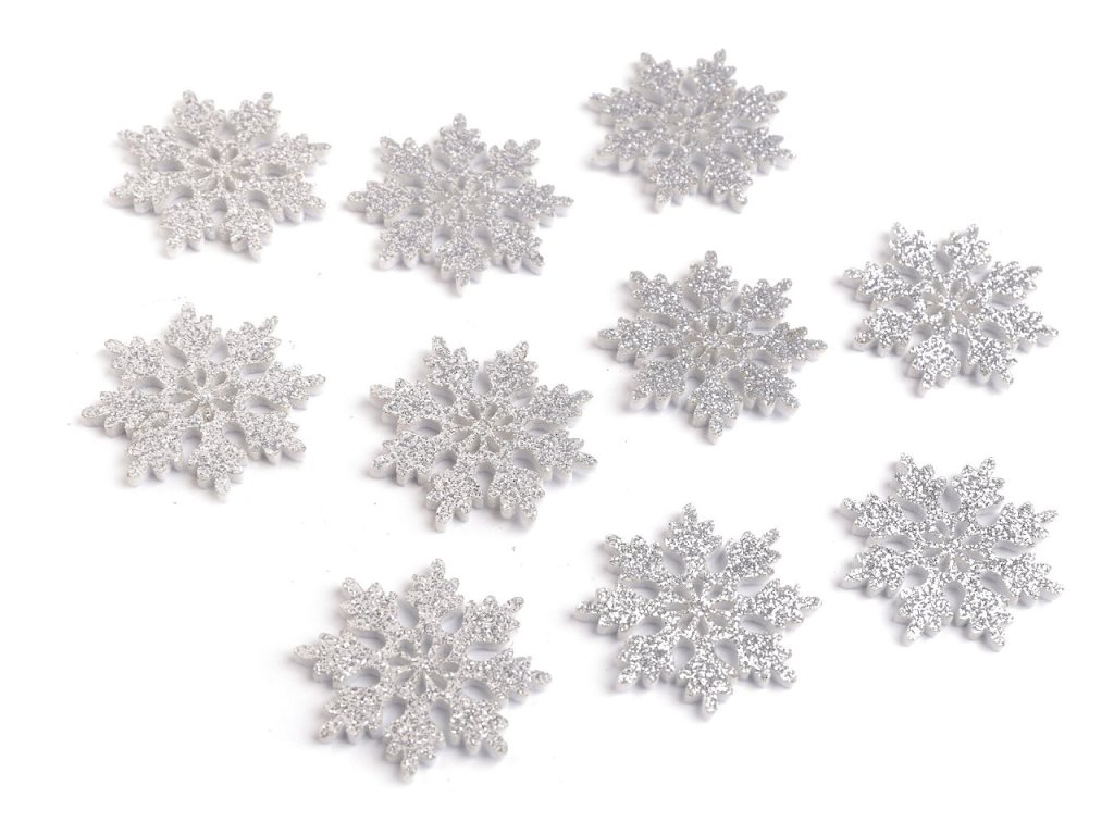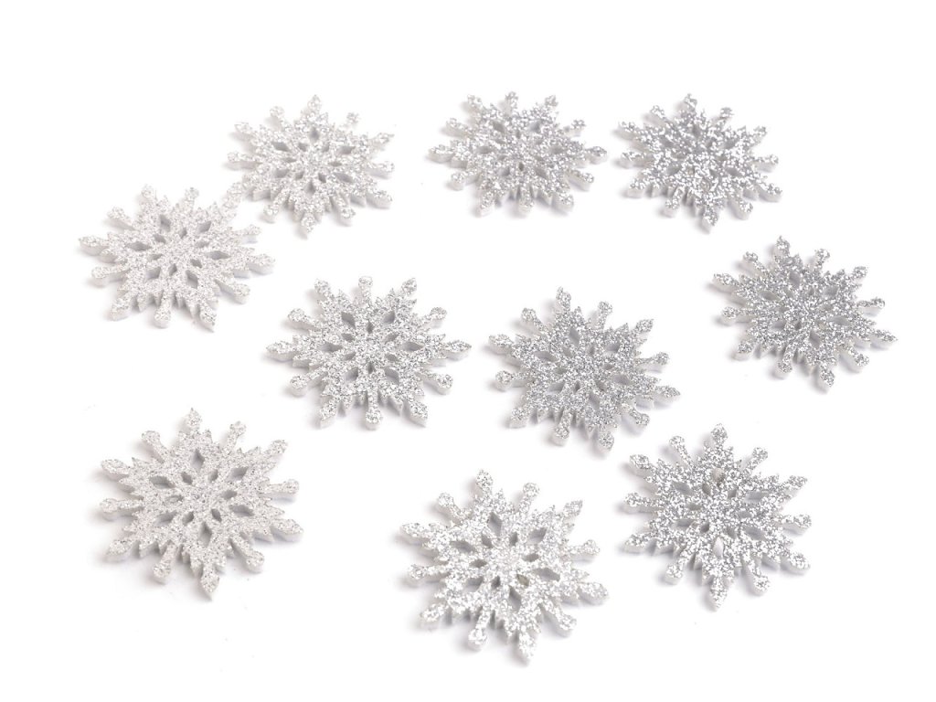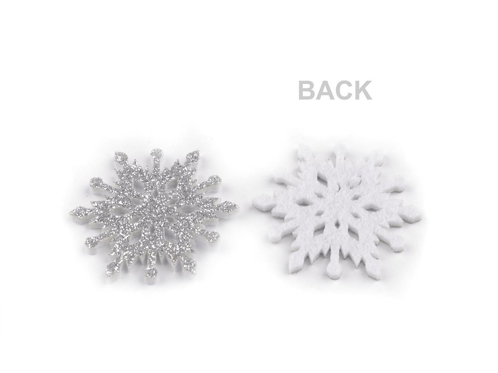 Filcové vločky zdobí z jedné strany třpytivé glitry. Můžete je nalepit na adventní věnce, truhlíky, jmenovky na slavnostní tabuli, dárky a různé vánoční dekorace. Glitry neopadávají.- Průměr: 40 mm
