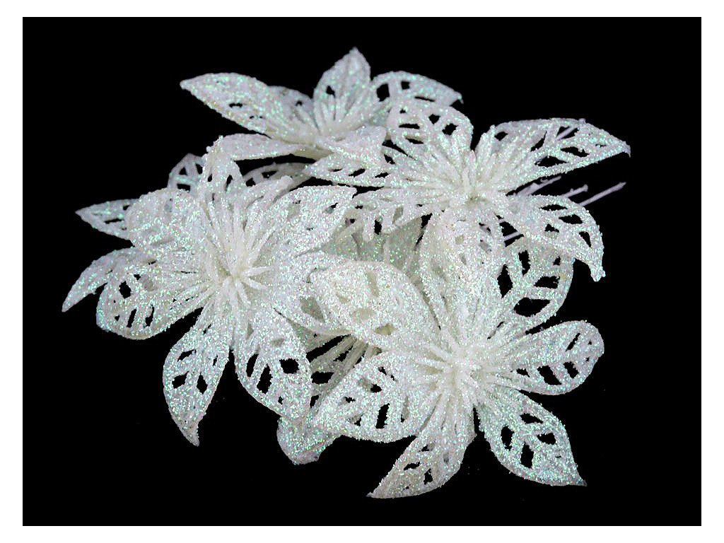 Třpytivá vánoční hvězda dodá vašemu vánočnímu interiéru nádech luxusu a elegance. S pomocí zářivých glitrů oživí vánoční vazby, věnce, sváteční tabule či vánoční stromečky. Stonek hvězdy se dá lehce tvarovat díky ohebnému drátku.- Průměr květu: 7 cm
