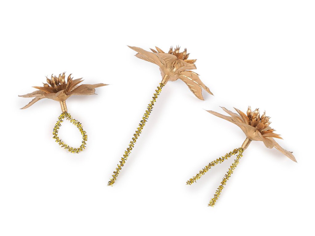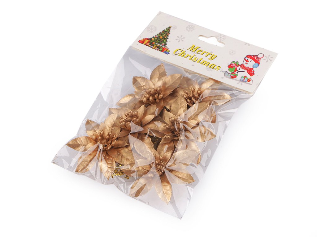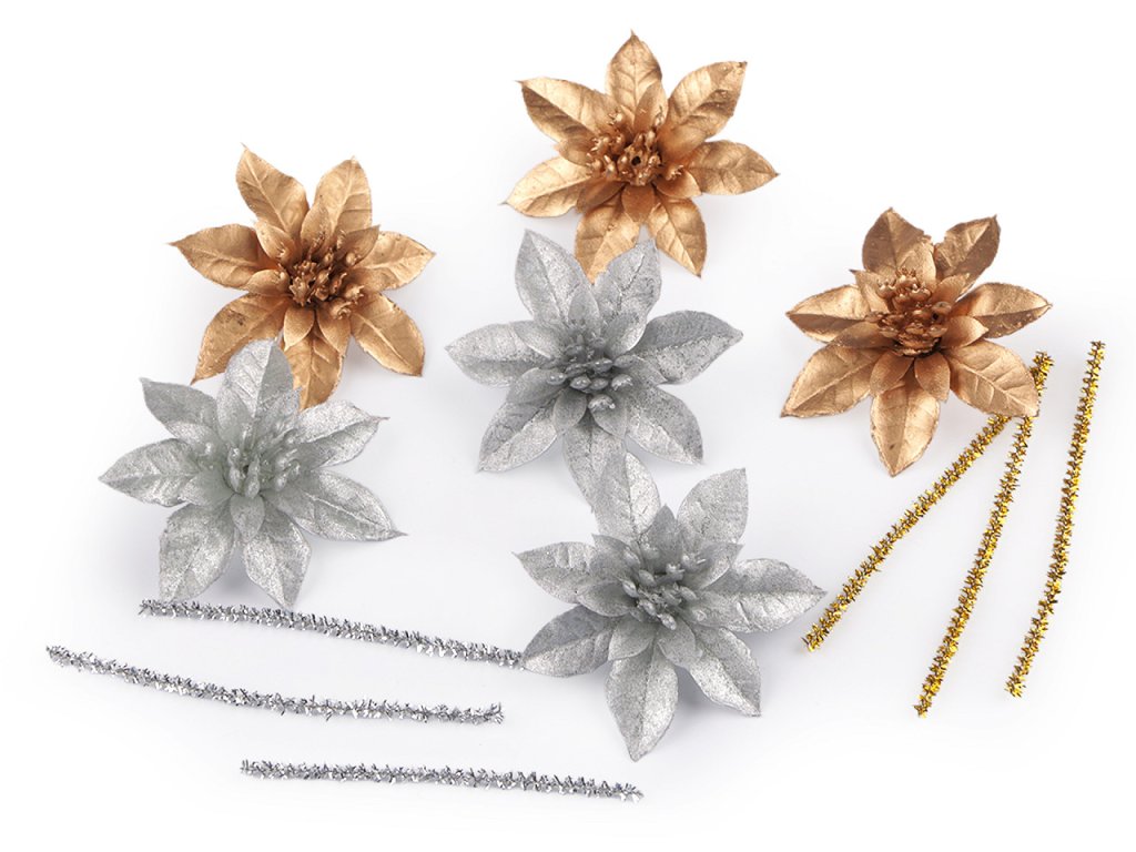 Metalické vánoční hvězdy jsou poutavým detailem sváteční výzdoby. V balení najdete chlupaté drátky, díky kterým můžete květy připevnit do věnců, různých vánočních aranžmá, na stromeček, na dárky apod.- Průměr květu: 6 cm