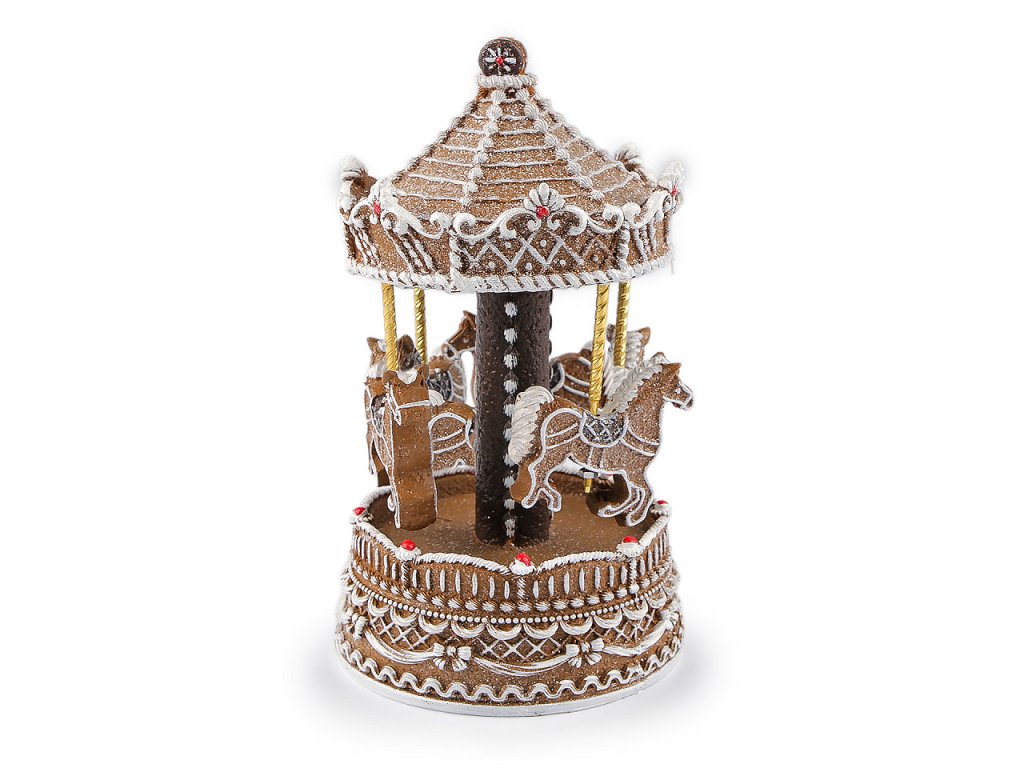 Vánoční kolotoč vyniká působivými detaily a věrohodně imituje perník. Je pohyblivý, hraje vánoční melodii "Rolničky" a pokrývají ho třpytivé glitry. Zútulní každý interiér a vnese do něj nádech nostalgie. Kolotoč se spouští natažením strojku, který je zabudovaný v horní části dekorace.- Průměr: 11,5 cm