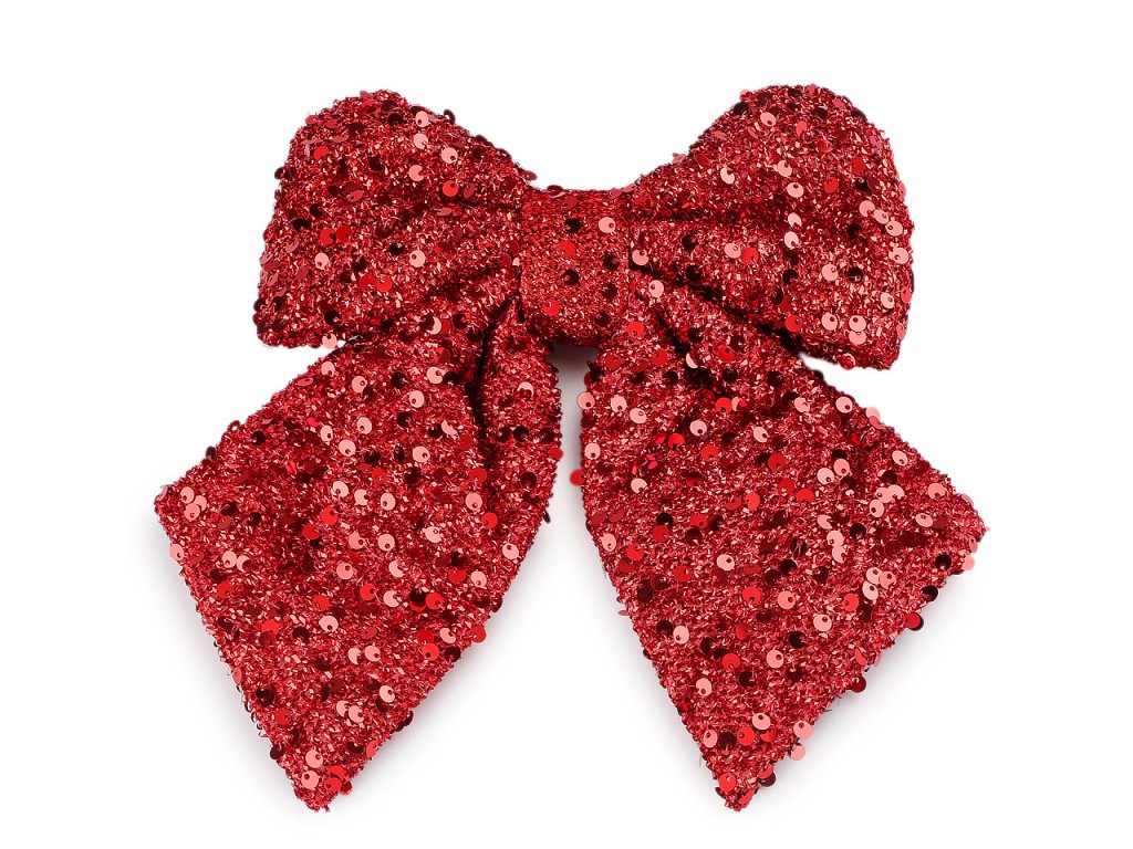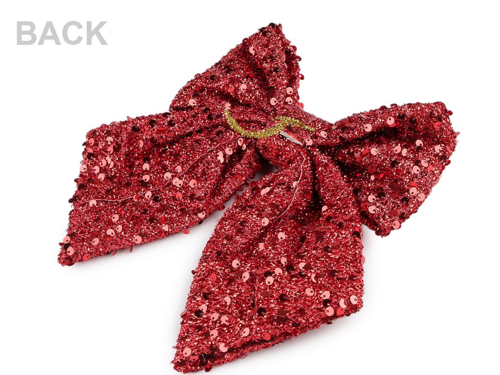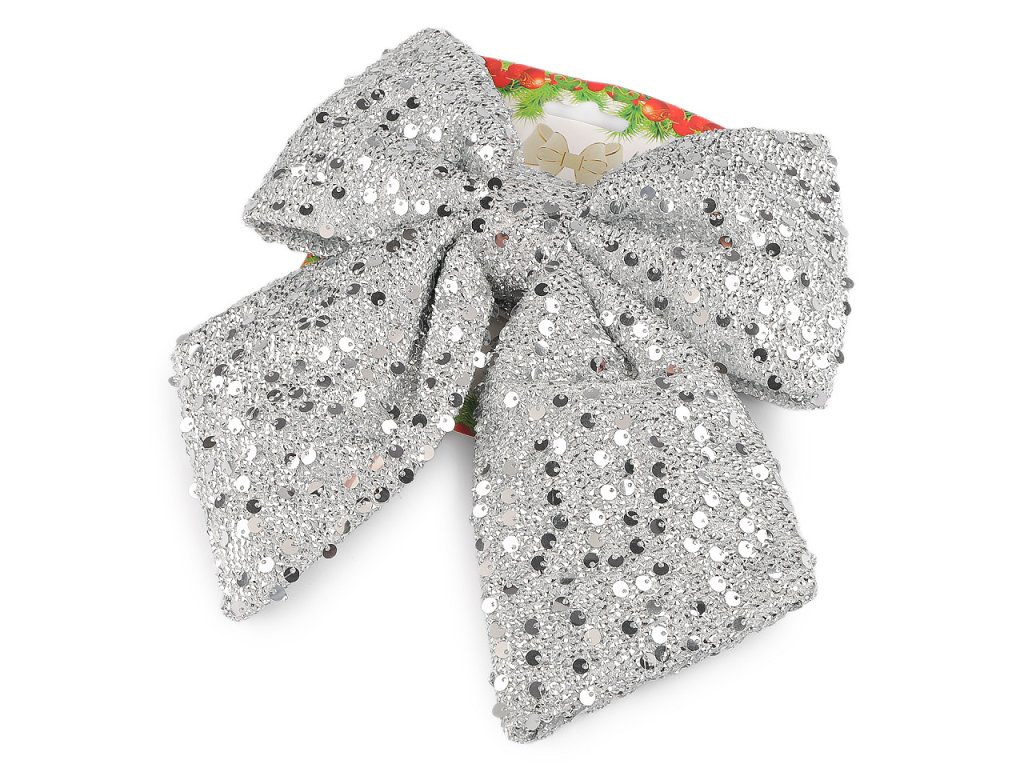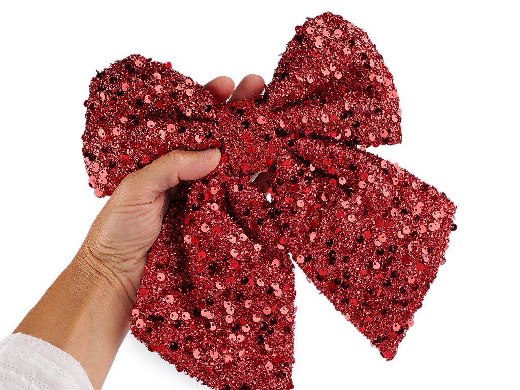 Vánoční mašle s flitry vyniká nejen slavnostním třpytem, ale i působivou velikostí. Elegantně ozdobí stromeček, dekorační věnce, dveře, židle, velké dárky apod. Připevníte ji lurexovým drátkem, který je součástí mašle.- Rozměry: cca 21 x 24 cm
