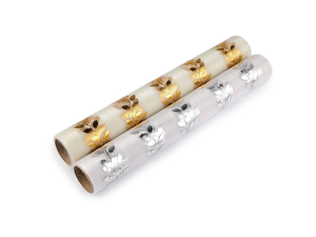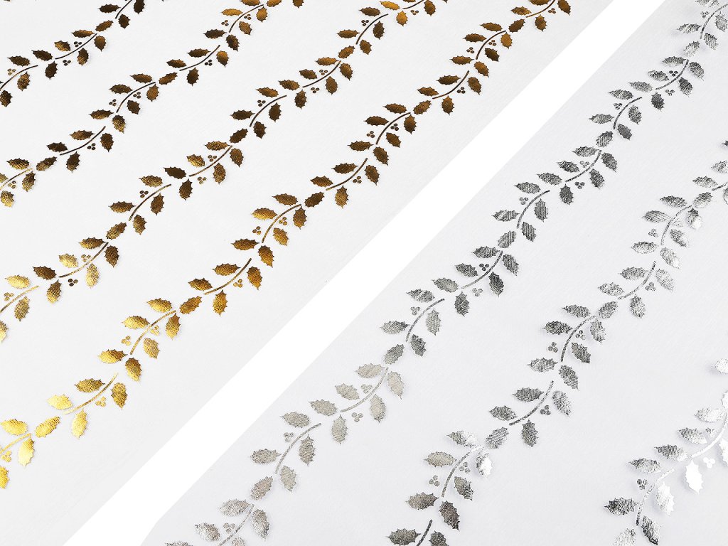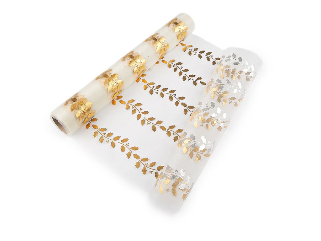 Dekorační organzu využijete na zdobení slavnostní tabule, ale je vhodná i k aranžování a tvorbě různých dekorací. Potisk cesmíny je metalický a jednostranný.- Šíře: 36 cm