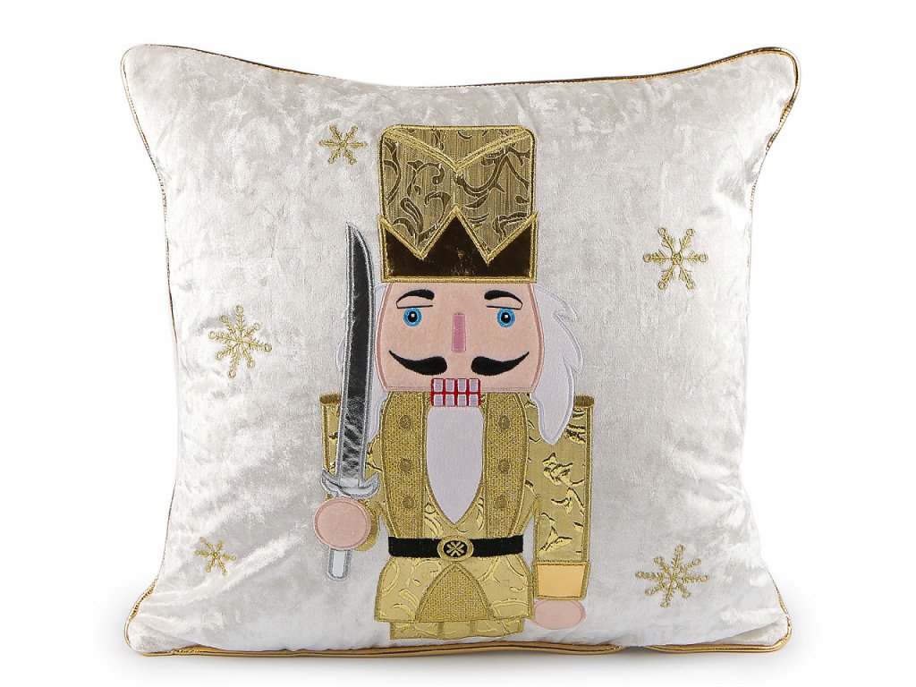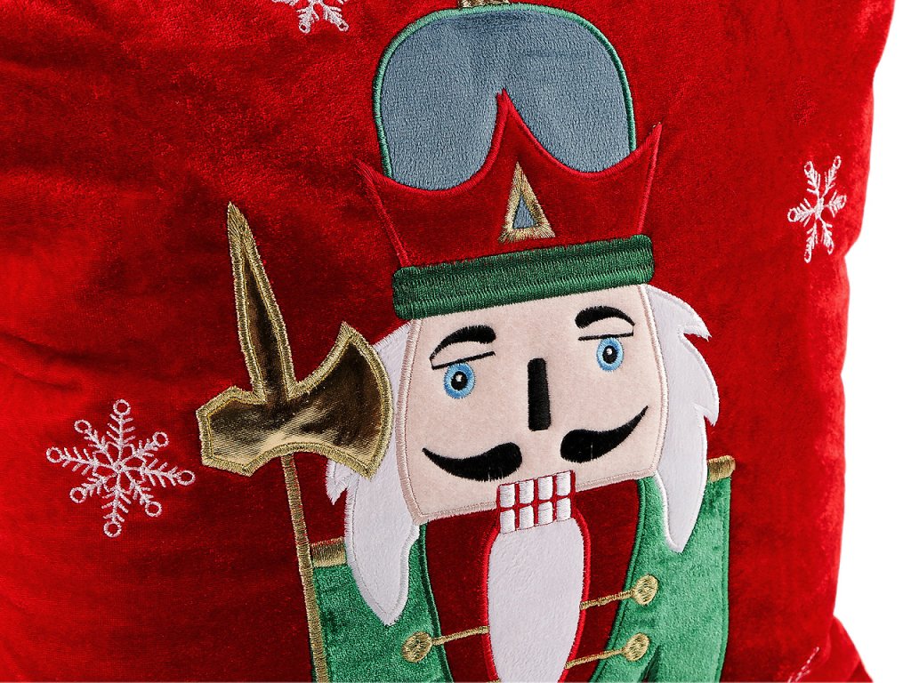 Sametový povlak na polštář zdobí vánoční motiv louskáčka. Do interiéru vnese tradiční vánoční kouzlo a přispěje k pohodové atmosféře, jeho jemný a hebký materiál poskytuje příjemný dotek. Povlak je jednostranný, velice kvalitní, motiv louskáčka tvoří pevně našitá aplikace s výšivkou a metalickými detaily. Vločky jsou vyšité. Okraj povlaku je olemovaný zlatou paspulkou. Zapíná se na zip. Toto je povlak na polštář, výplň můžete koupit zvlášť.- Rozměry: 43 x 43 cm