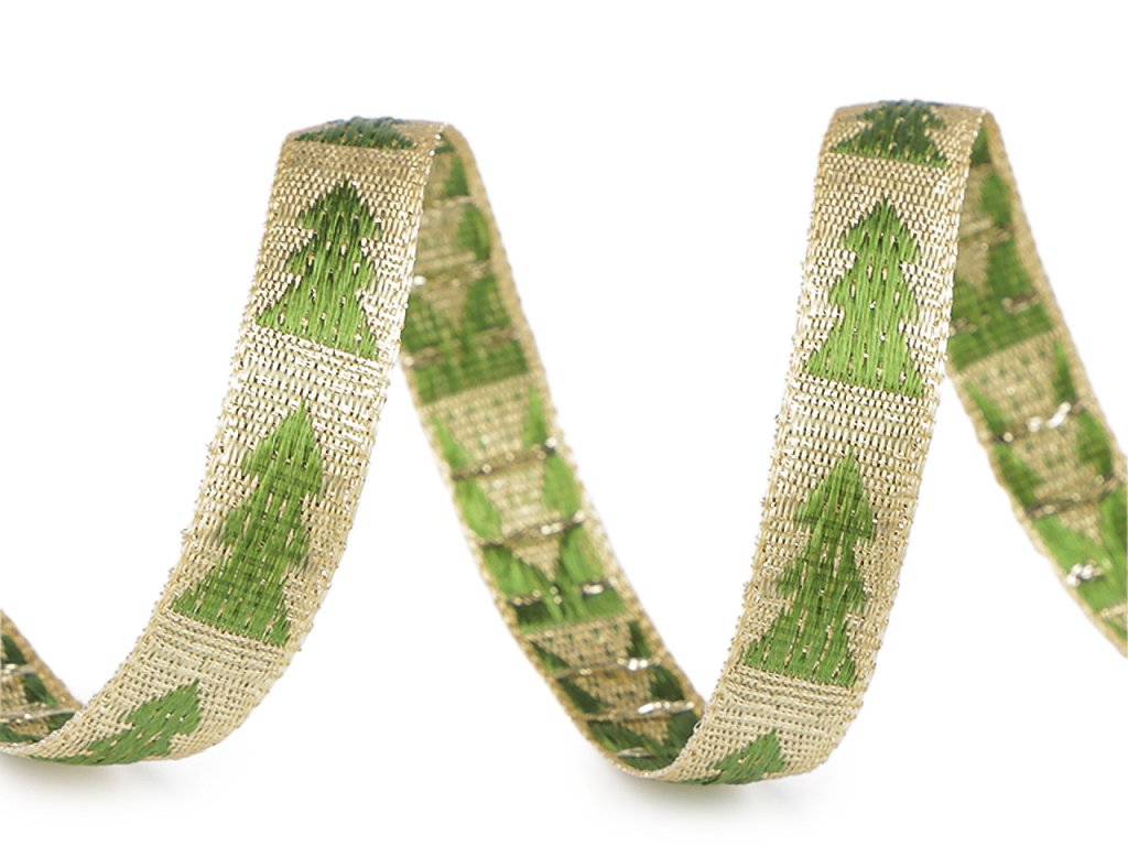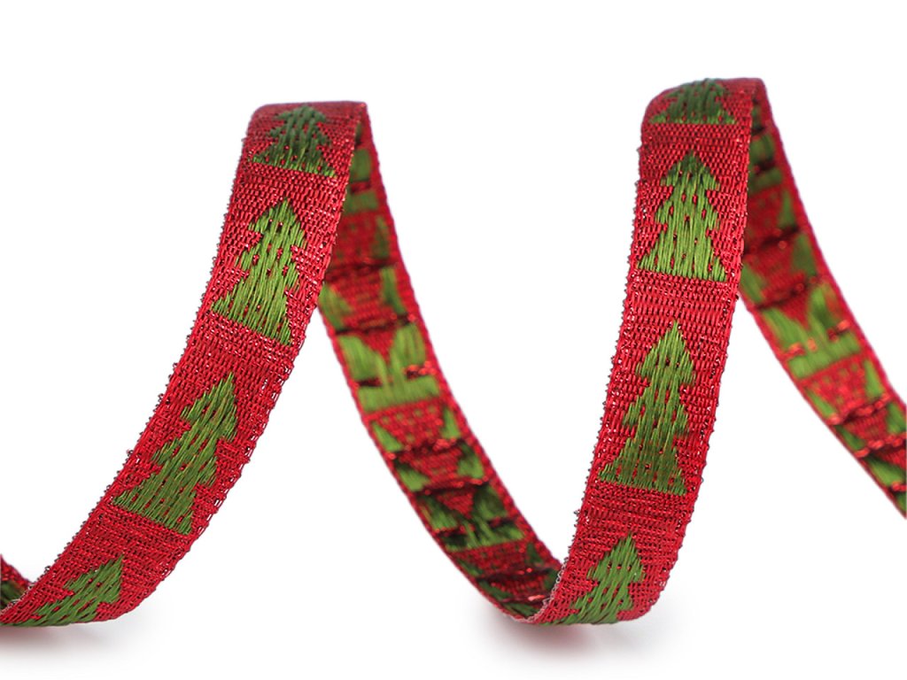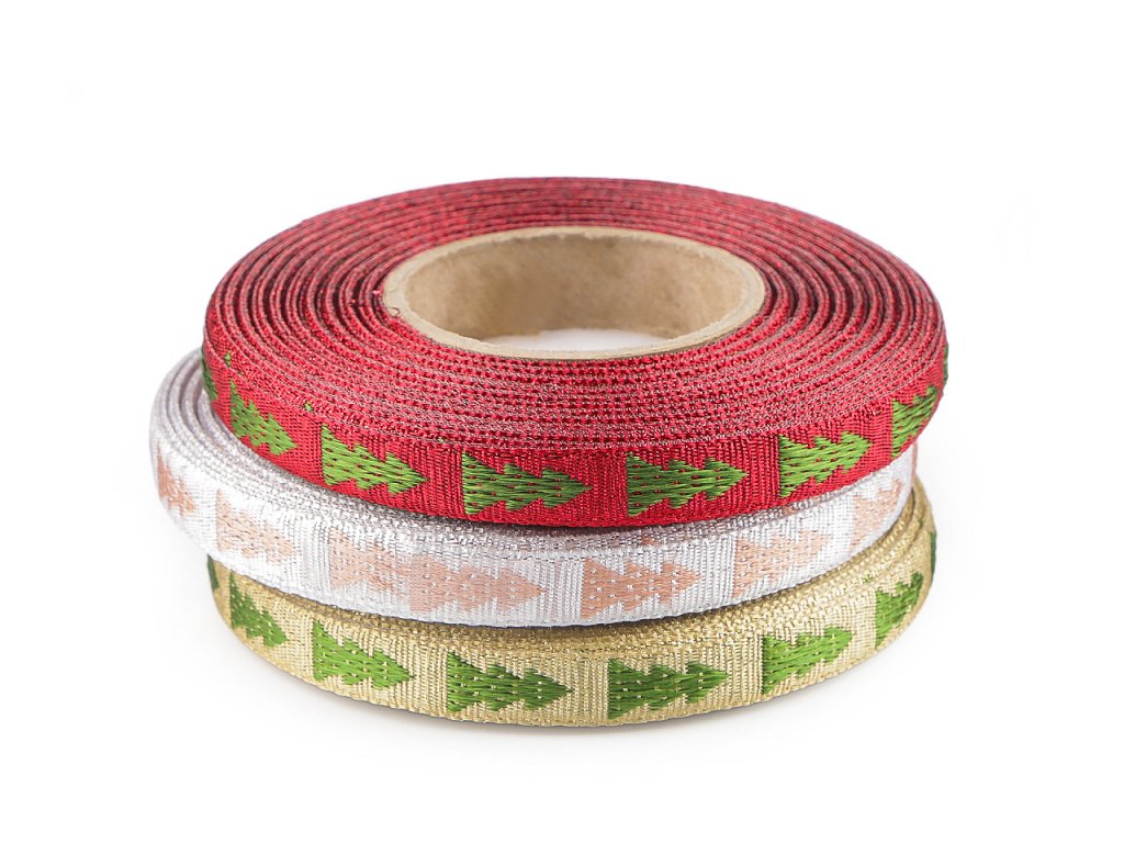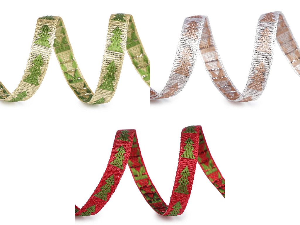 Vánoční dekorační stuhu s lurexem zdobí jednostranný motiv tkaných stromečků. Tkaná vazba je kvalitní, velice pevná, stuha se celá třpytí. Použití: Stuhu využijete na vánoční dekorace i na balení dárků. Je vhodná také k aranžování věnců, vazeb a ikeban.- Šíře: 10 mm