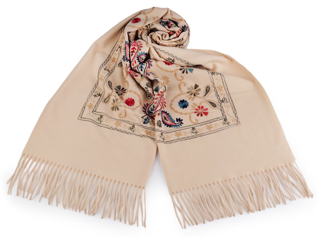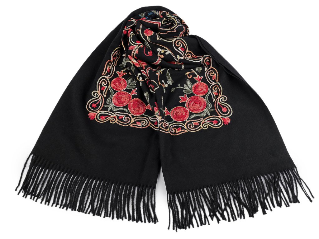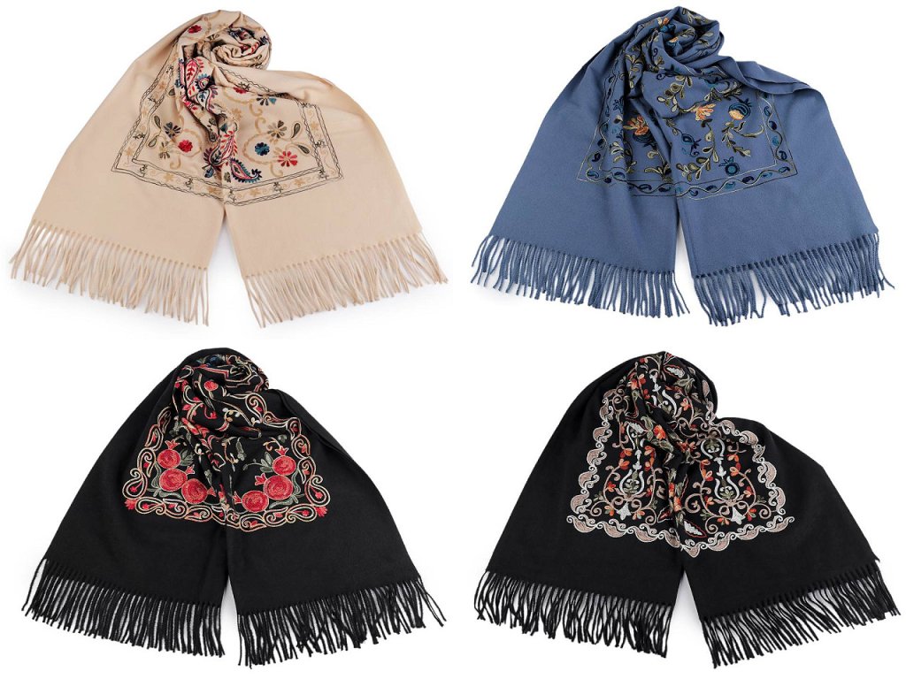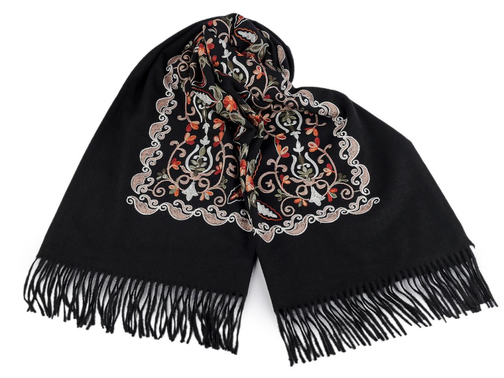 Velký teplý šátek / pléd vyšívaný s třásněmi, typu kašmír 70x180 cm