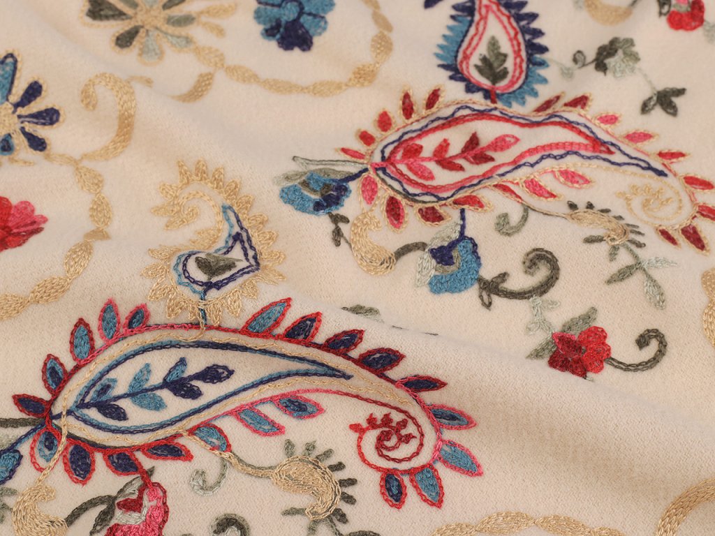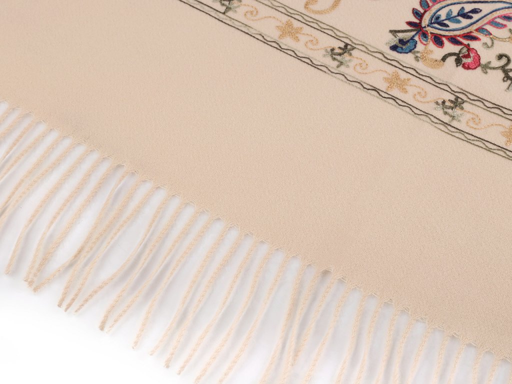 Velký vlněný šátek typu kašmír je elegantním módním doplňkem, který zaujme svou nádhernou výšivkou. Je velice kvalitní, komfortně vás zahřeje v sychravých dnech. Je vyrobený z materiálu příjemně hebkého na dotek. Na koncích je zakončený dlouhými třásněmi. Můžete jej nosit do práce i do společnosti, výšivka má jemný lesk, elegantně dozdobí váš outfit. Upozorňujeme zákazníky, že složení na štítcích se může lišit, materiál je vlna a polyester.- Šířka: 70 cm