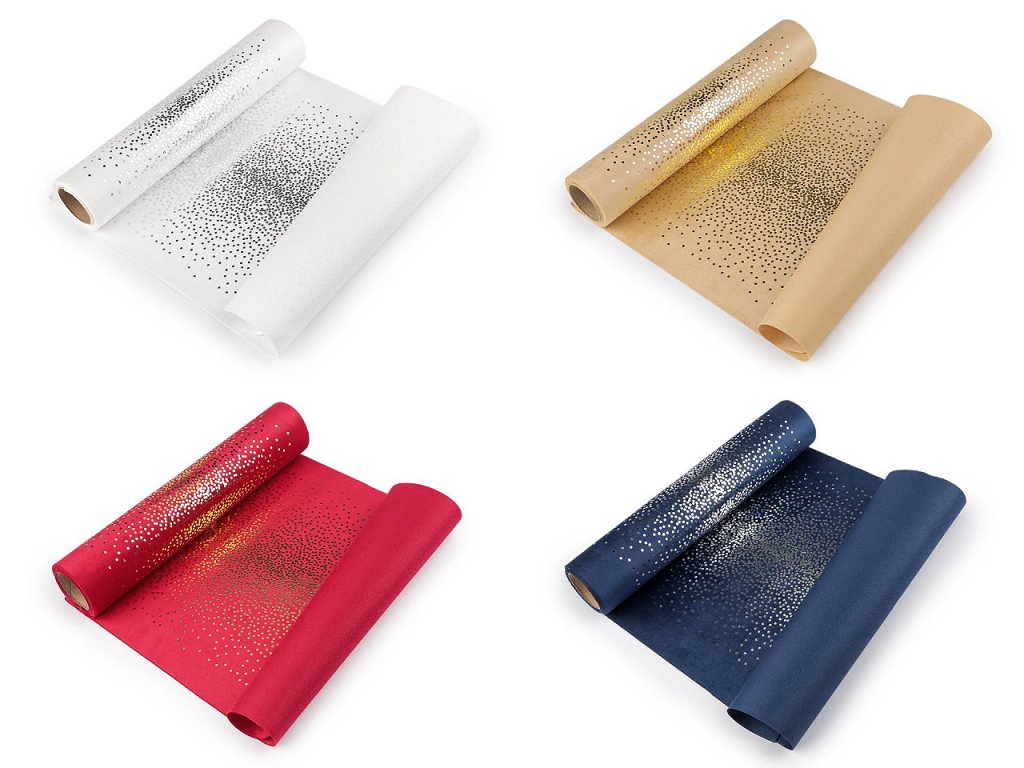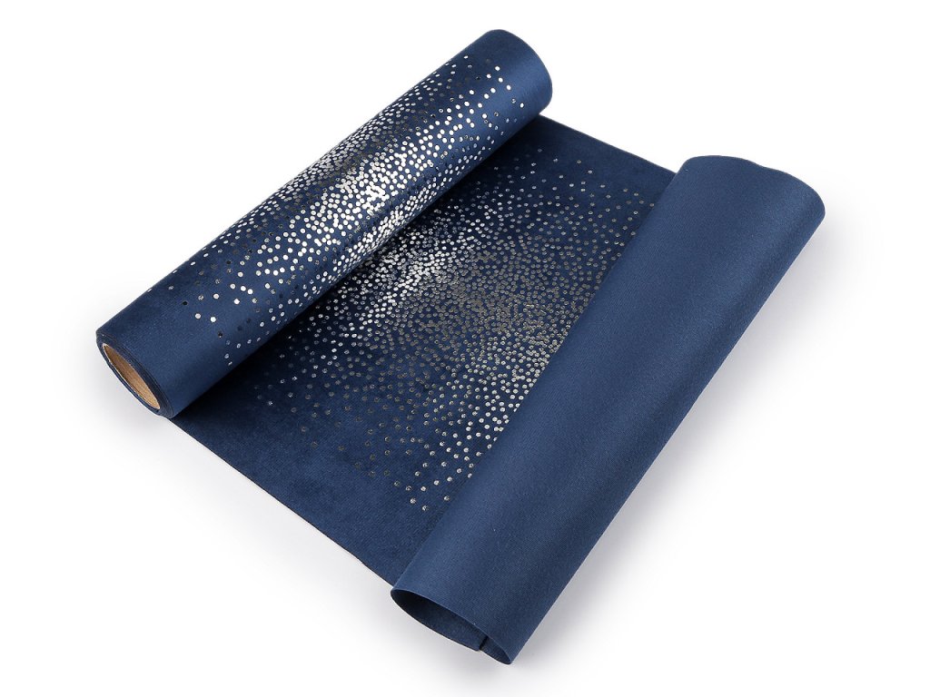 Velvet / samet působí luxusním a elegantním dojmem. Je příjemně měkký na dotek. Vynikne na slavnostní tabuli jako běhoun nebo prostírání. Zdobí ho metalický potisk drobných puntíků. Okraje materiálu se po ustřižení netřepí a není nutné je začišťovat olemováním.- Šíře: 28 cm
