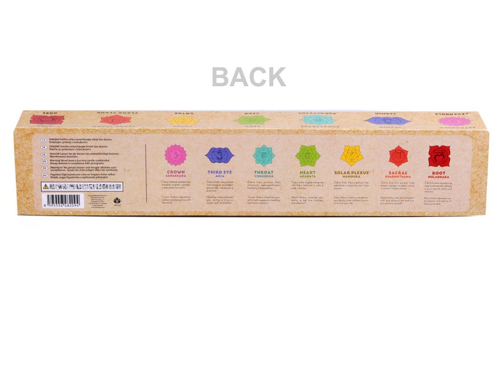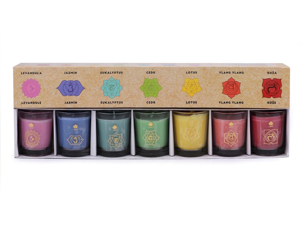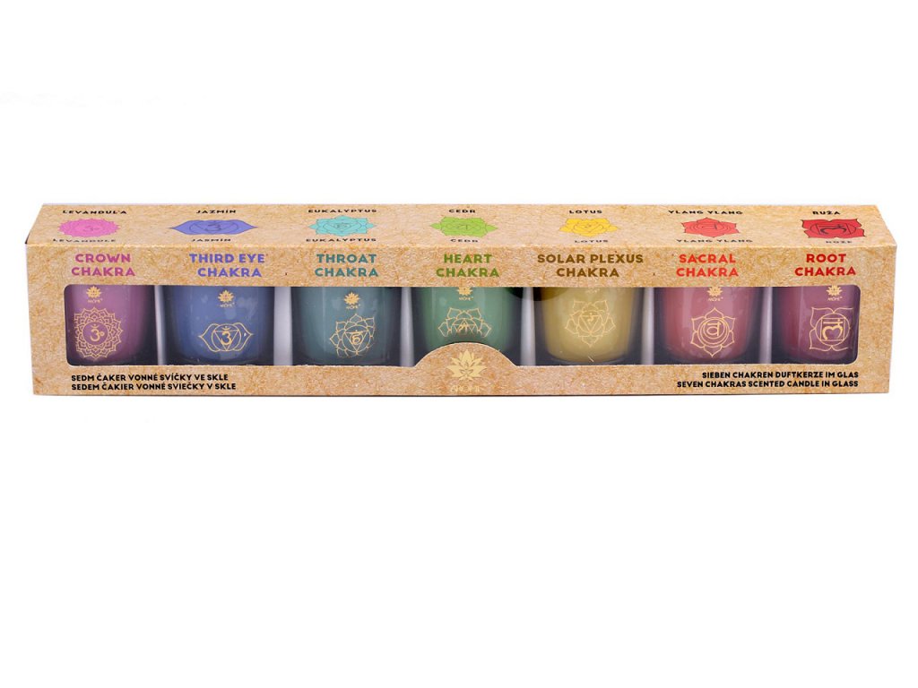 Velká sada vonných čakrových svíček ve skleněných dózách každého potěší. Vykouzlí pohodovou atmosféru, nádherně provoní interiér a zharmonizují život a duševní pohodu. Kromě toho, že jsou svíčky označené příslušnou barvou čakry, mají i samolepky s metalickým potiskem čakrového symbolu. Jsou zabalené v papírové krabičce s transaprentním okénkem s popisem čaker. Svíčky mají vůni (seřazeno od kořenové čakry po korunní) růže, ylang ylang, lotos, cedr, eukalyptus, jasmín a levandule.- Průměr: 5,2 cm