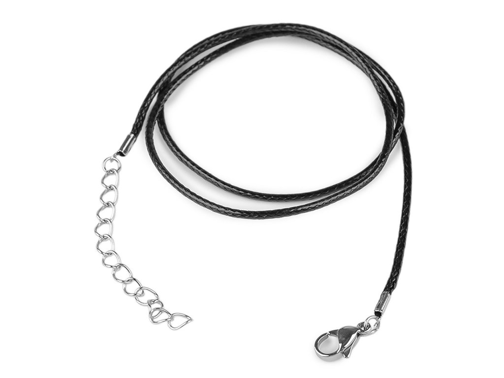 Šperková šňůrka je povrchově ošetřená voskováním. Má připevněné kompletní zapínání z nerezové oceli na karabinku. Stačí pouze navléct přívěsek a vyrazit. Samozřejmostí tohoto hotového výrobku je prodlužovací řetízek. Délka 45 cm + 5 cm adjustační řetízek. Karabinka 7 x 12 mm, šňůra má průměr 1,5 mm.- Průměr: 1,5 mm