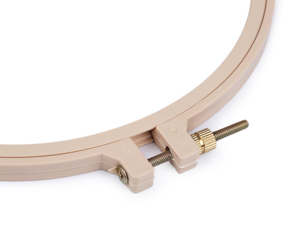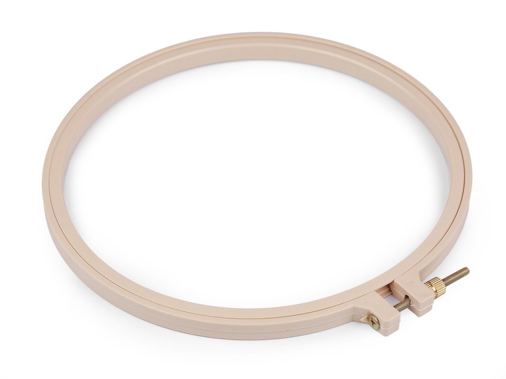 Plastový kruh využijete na vyšívání. Je pevný, opatřený kovovým stahovacím šroubkem, pomocí něhož přichytnete vyšívací tkaninu. Kromě vyšívání ho můžete použít také na aranžování nebo výrobu lapačů snů.- Vnitřní průměr: 18 cm