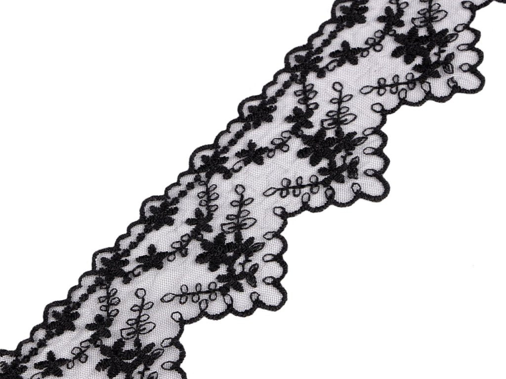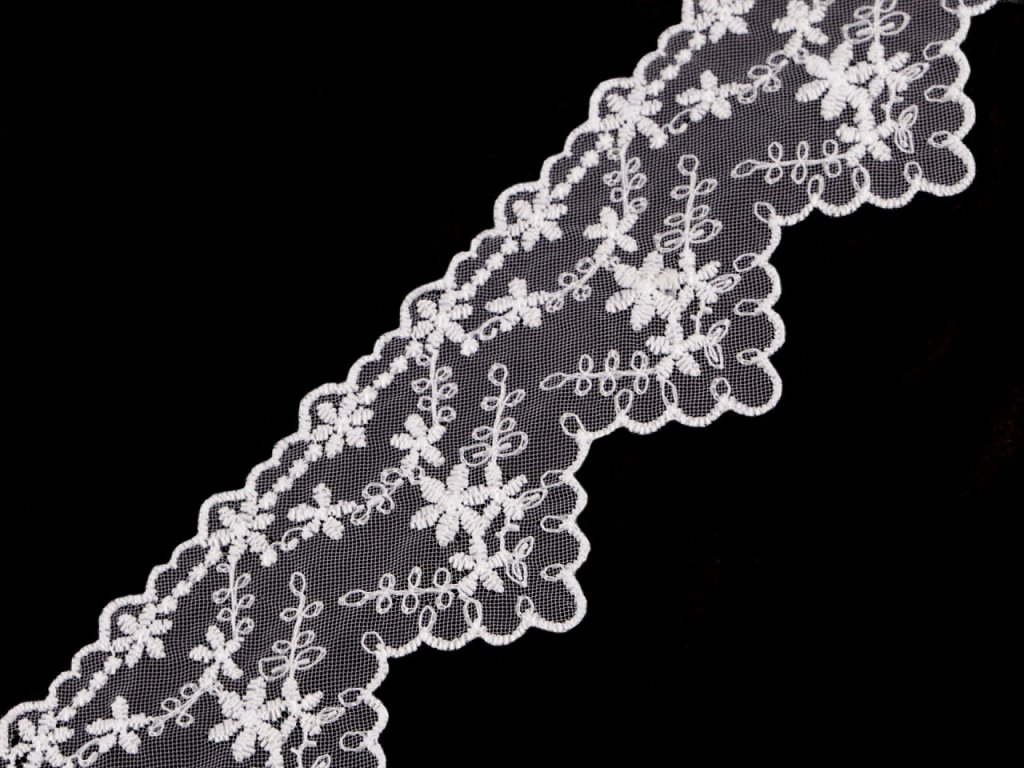 Vyšívaná krajka na monofilu působí jemně a romanticky. Vynikne na plesových, večerních i svatebních šatech, sukních, halenkách apod.- Šíře: 65 mm
