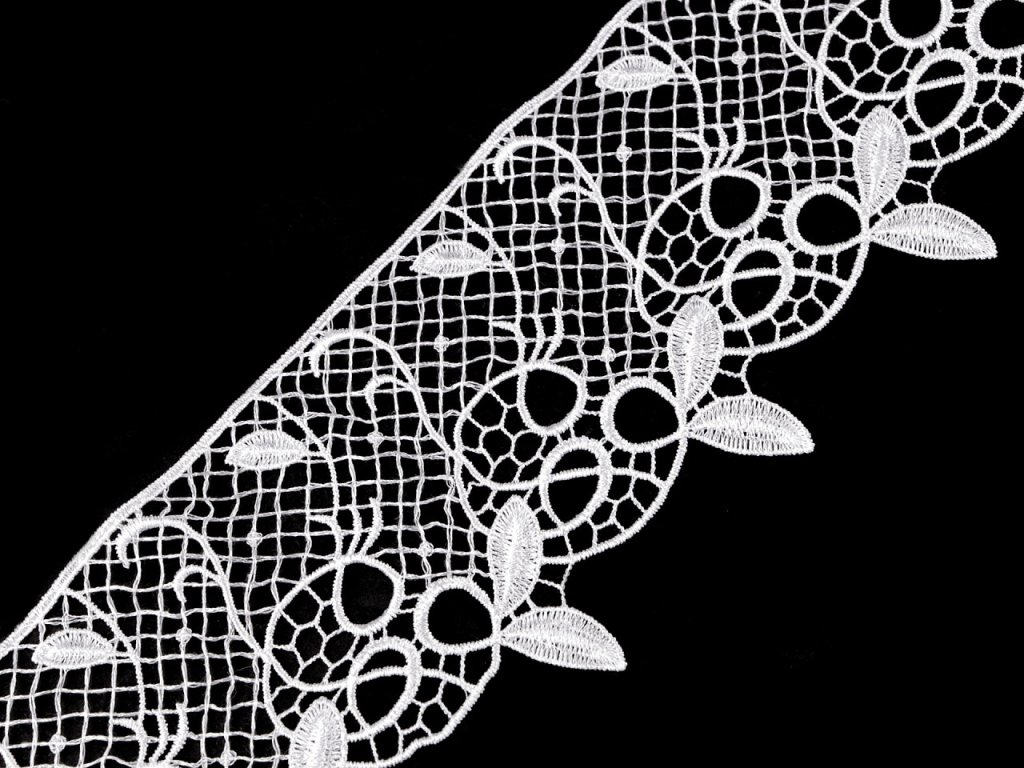 Široká vzdušná krajka je zajímavá svým propracovaným vzorem. Je ideální pro ty, kteří chtějí dodat svým výrobkům luxusní a zároveň něžný vzhled. Krajka je pevná, není pružná. S její pomocí snadno vytvoříte unikátní kousky, které zaujmou svou elegancí a jemnými detaily. Použití: Krajkou můžete oživit oděvy, například šaty, sukně, halenky apod. Je vhodná také na dekoraci ubrusů, polštářů a závěsů.- Šíře: 90 mm