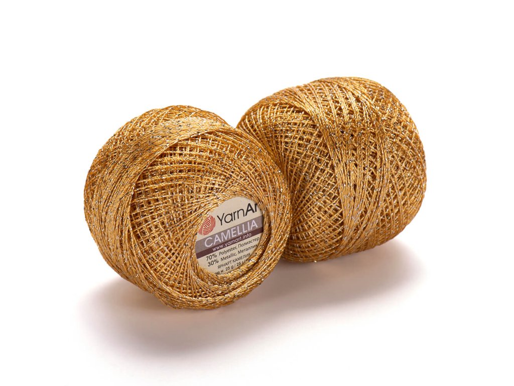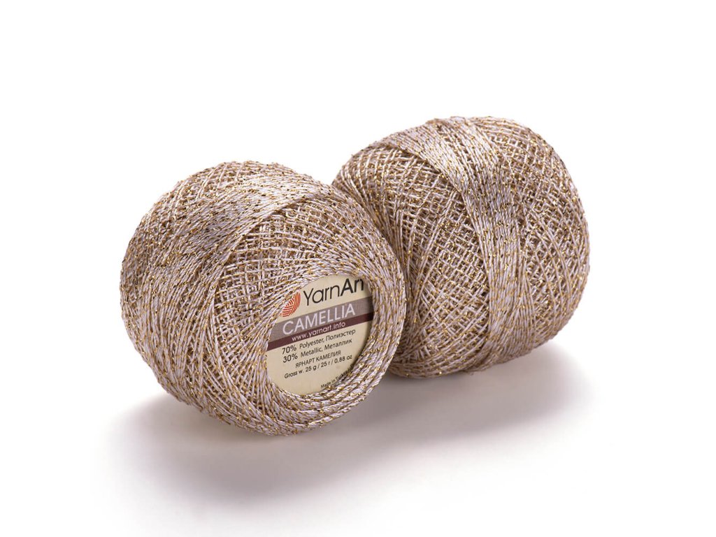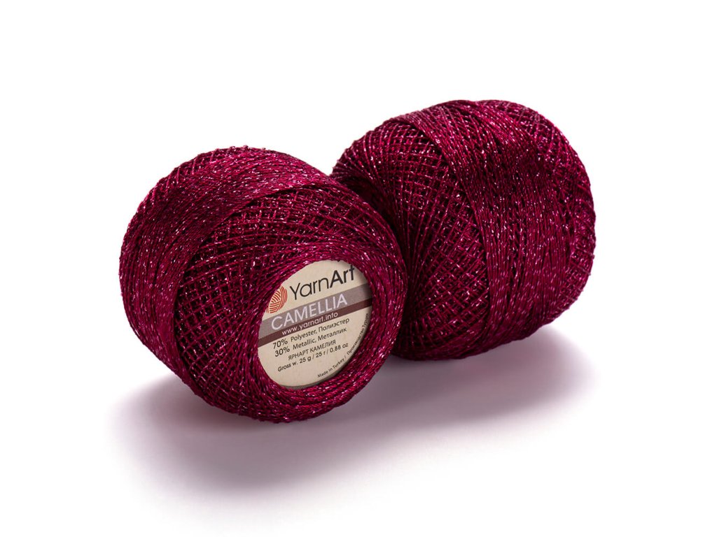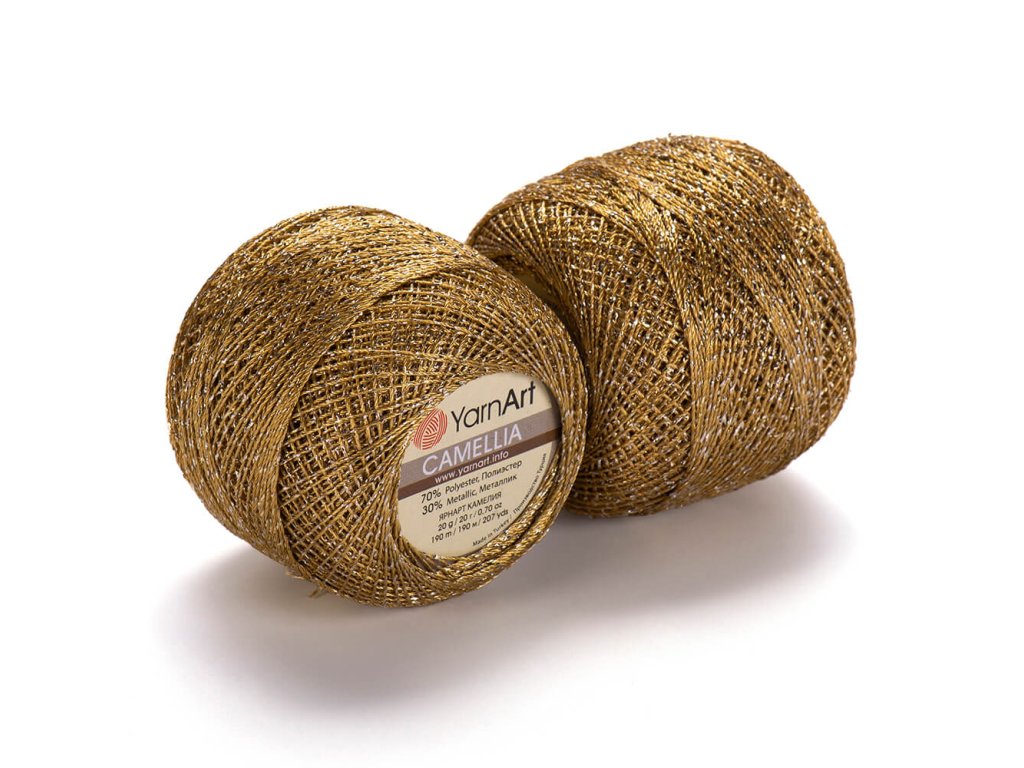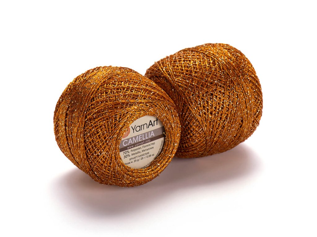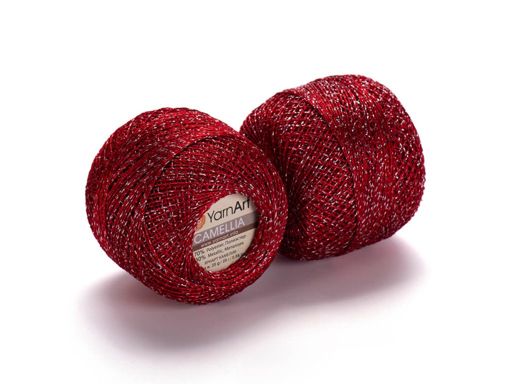 YarnArt pletací a háčkovací příze Camellia s nádherným metalickým odleskem, jedinečná k výrobě třpytivých dekorací a kouzelných vánočních ozdob a baněk. Tato tenká lurexová pletací a háčkovací příze je také vhodná jako efektní příplet k dalším YarnArt přízím, každému kousku dodá lesk a originalitu.