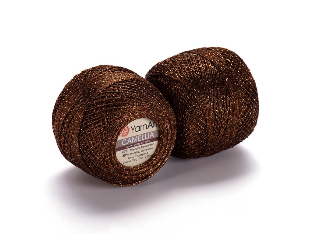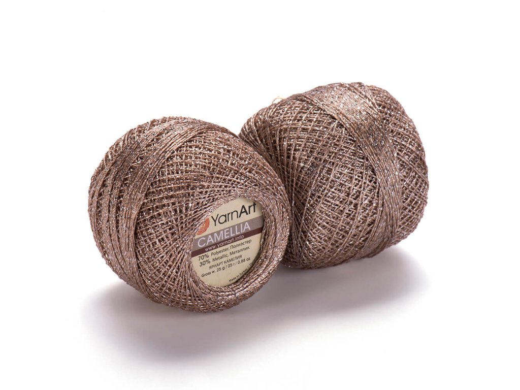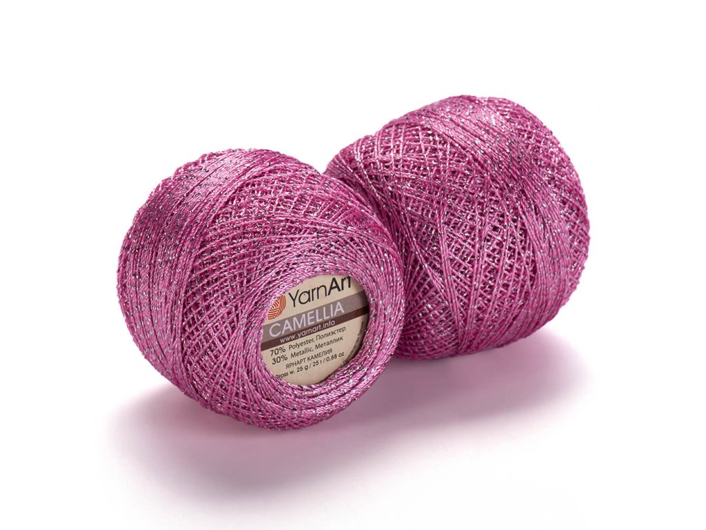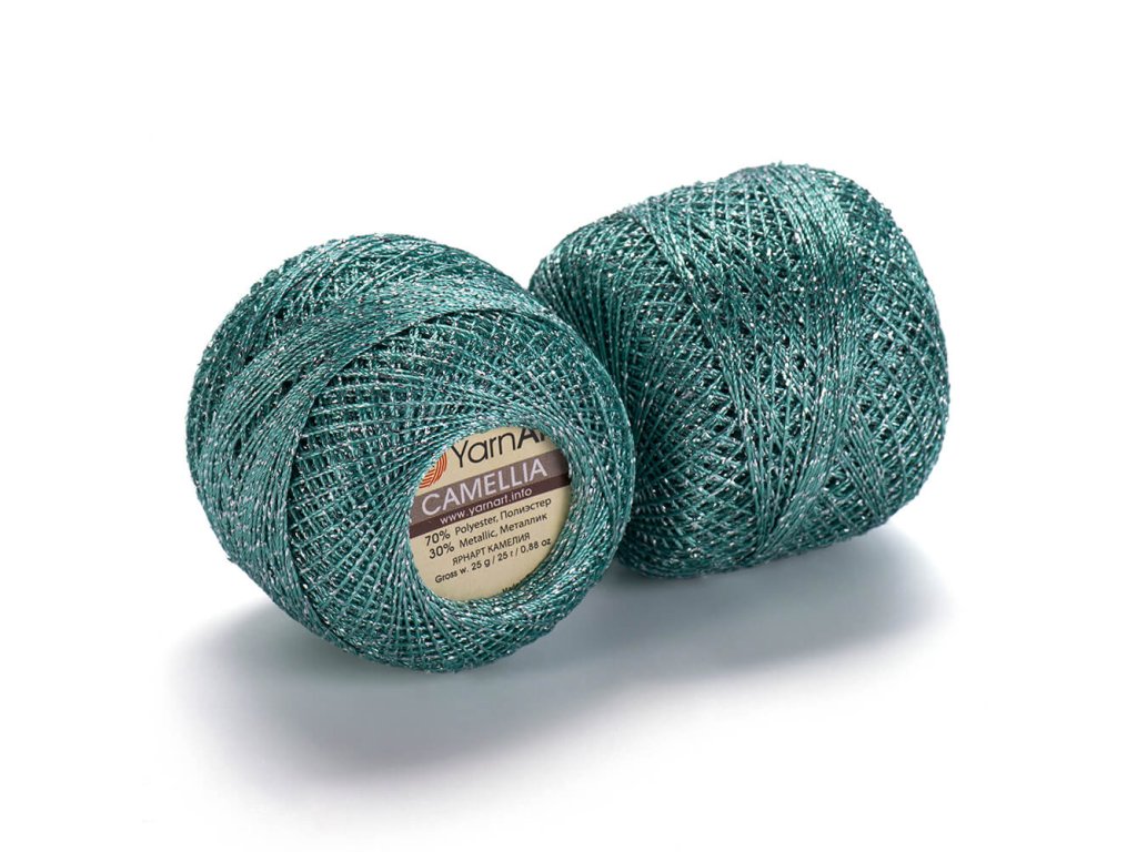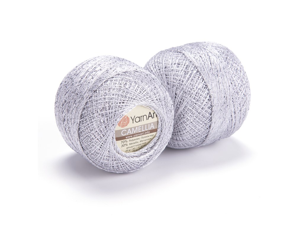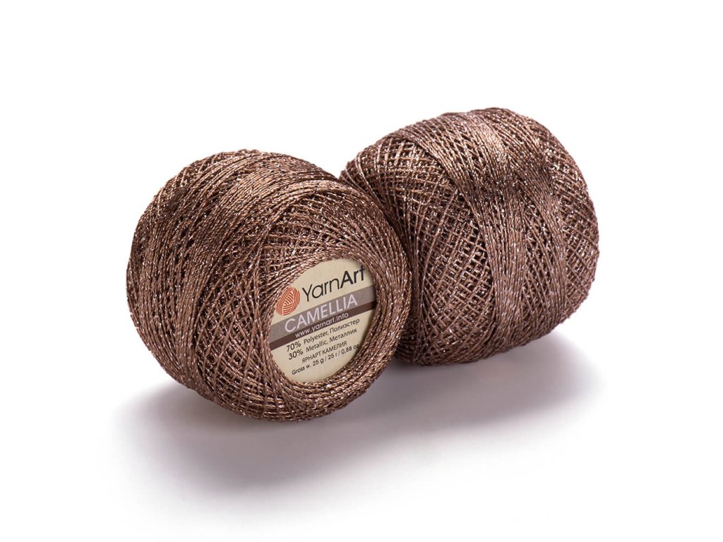 YarnArt pletací a háčkovací příze Camellia s nádherným metalickým odleskem, jedinečná k výrobě třpytivých dekorací a kouzelných vánočních ozdob a baněk. Tato tenká lurexová pletací a háčkovací příze je také vhodná jako efektní příplet k dalším YarnArt přízím, každému kousku dodá lesk a originalitu.