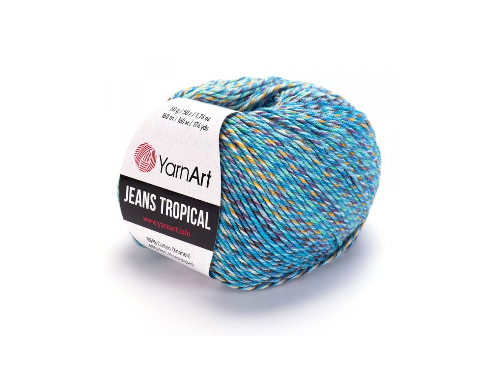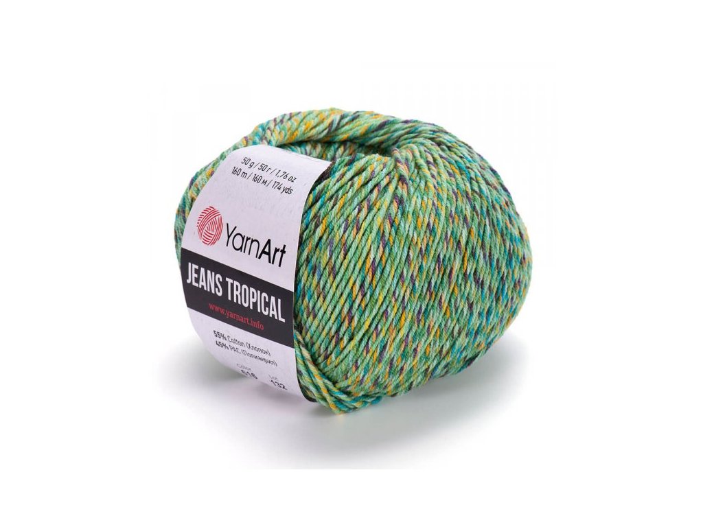 Jeans Tropical příze 10x50g. Svěží žíhaná alternativa velmi oblíbené příjemné směsové příze Jeans. Vhodná na pletení i háčkování čepiček, svetříků a hlavně dětských hraček a bytových doplňků. 55% bavlna, 45% polyakryl. 50g/160m, háček/jehlice: 3,5mm. Tato příze je atestována TZÚ pro děti do 3 let.