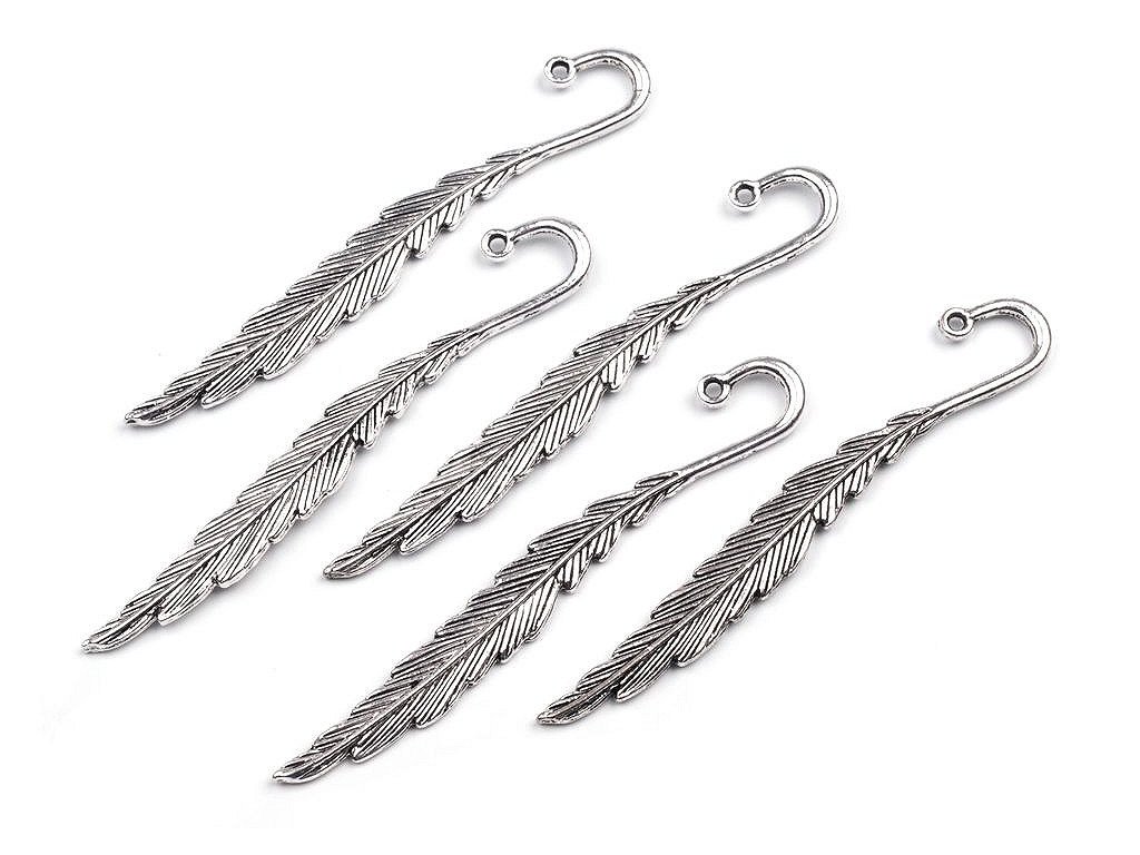 Kovový polotovar určený k výrobě záložky do knihy. Je zcela na vás, jak si záložku dotvoříte. Pokud si přejete menší záložku, stačí k očku připevnit např. stužku, korálky, přívěsek. Pokud chcete větší záložku, vystřihněte pruh z pevné látky nebo tvrdého papíru, na který upevníte toto pírko pomocí provázku, bavlny, mašličky atd. Ideální k rozproudění vaší fantazie. Pírko je zdobené a má kulatý háček, který můžete zavěsit za okraj knihy. Zdobení je oboustranné. Rozměry: 1 x 8 cm (šířka v nejširším místě x délka), průvlek 2 mm.- Rozměry: 10 x 80 mm