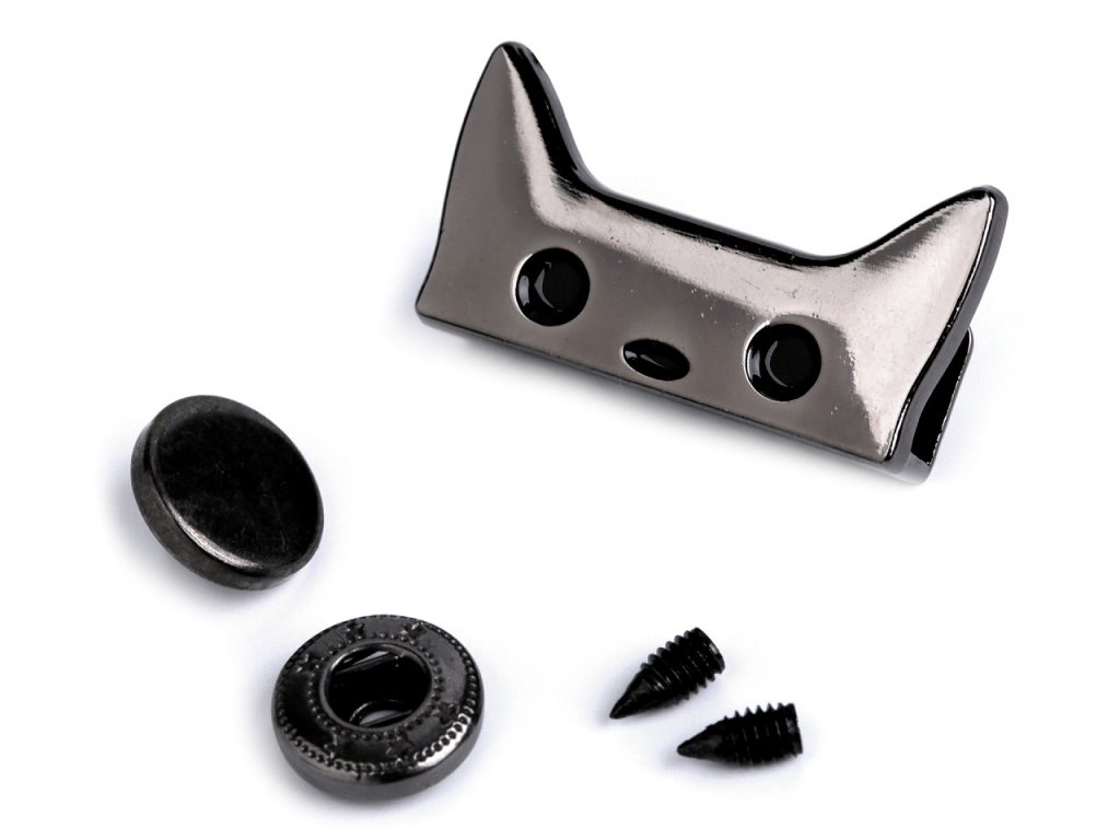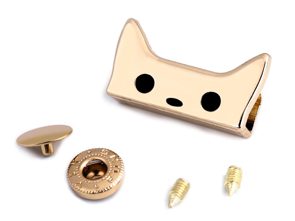 Zapínání ve tvaru kočky využijete na tašky, peněženky či kabelky s klopou. Díl s kočkou připevníte do klopy pomocí přiložených šroubků. Wuk (Ø10 mm) se připevní lisem a pistonem. Vhodné pro látky s tloušťkou do 5 mm. 1 sada obsahuje: nasazovací díl kočky, 2 šroubky, 1 přední a 1 zadní část wuku.- Rozměry: 14 x 27 mm