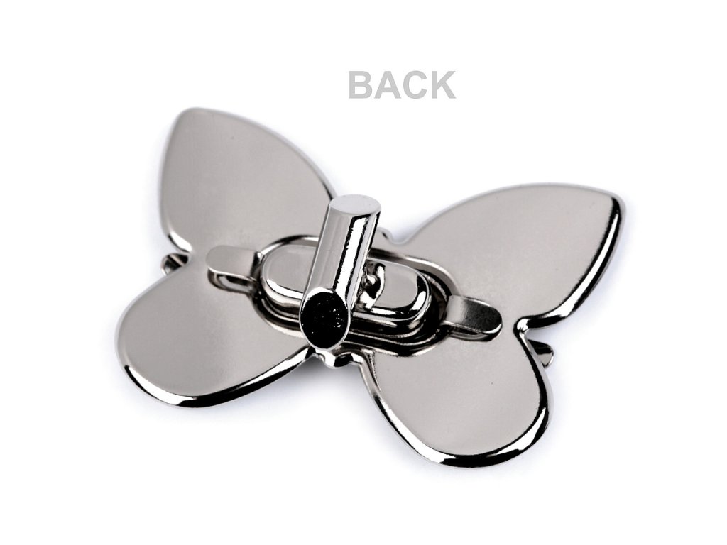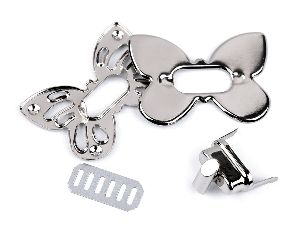 Zapínání ve tvaru motýla na kabelku či tašku se skládá ze čtyř dílů. Plíšek se připevní na vnitřní část tašky, díl s nožkami na vnější část (nožky se zaháknou do plíšku a roztáhnou). Stejným způsobem se připevní i díly s motýlem - část s nožičkami se připevní na vrchní část chlopně. Rozměry: - plíšek: 12 x 26 mm - díl s nožkami: 10 x 21 mm - díly s motýlem: 37 x 52 mm- Rozměry: 37 x 52 mm